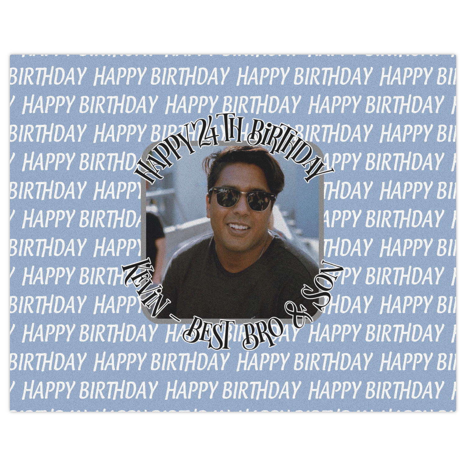 This design has a subtle background that says "Happy Birthday". You are able to upload your own picture of the birthday boy or girl right onto your design. The personalized text goes above and below your picture. This is a great design for pictures of you and the birthday boy/girl, so they can look at that cherished memory every day.