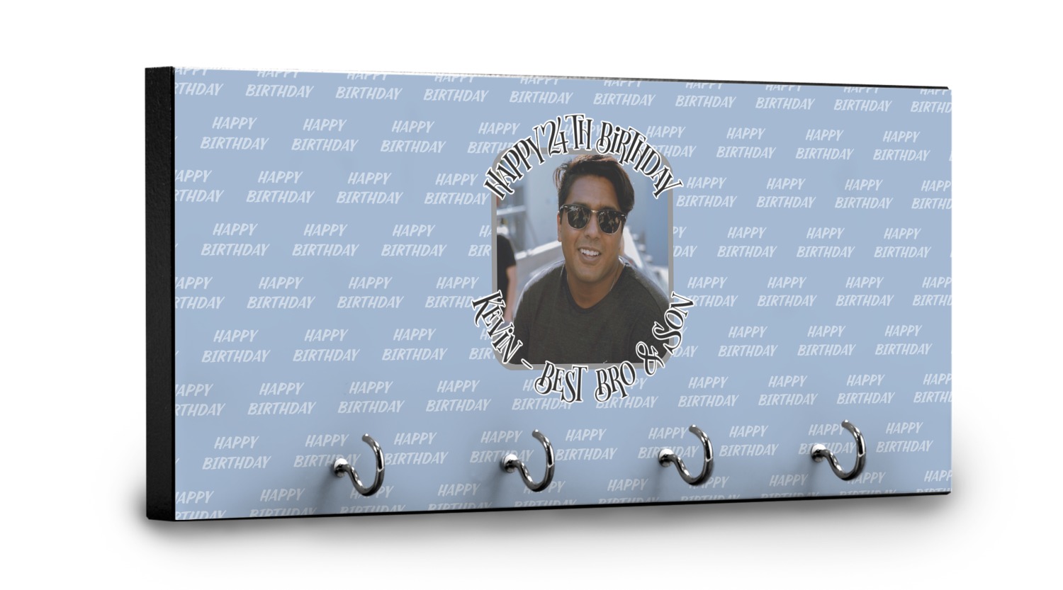This design has a subtle background that says "Happy Birthday". You are able to upload your own picture of the birthday boy or girl right onto your design. The personalized text goes above and below your picture. This is a great design for pictures of you and the birthday boy/girl, so they can look at that cherished memory every day.