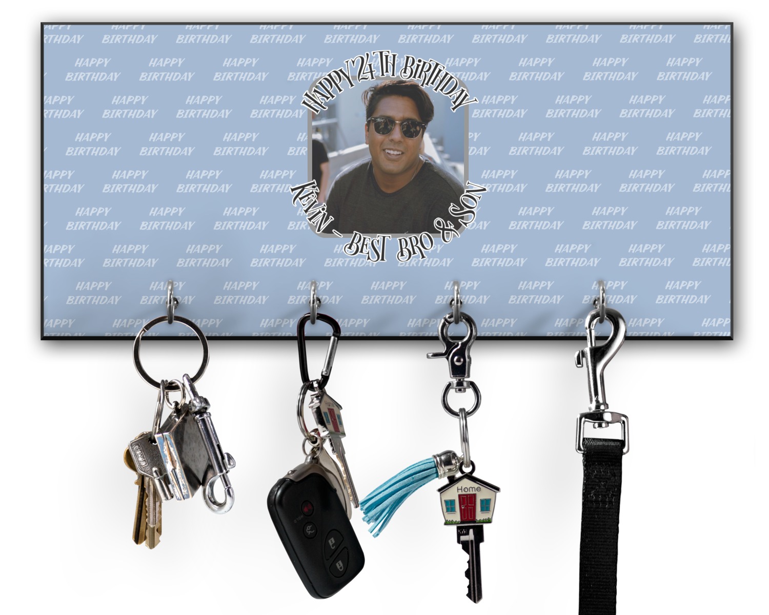This 11" x 5" key hanger is made of sturdy wood and has four metal hooks lining the bottom. This is the perfect size for a family with several drivers. Not only can you hang keys on it though, but pet leashes and other small items. The board is black on the sides and back and is printed with the design of your choice on the front.