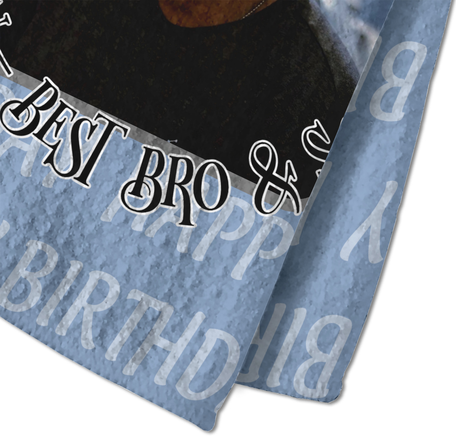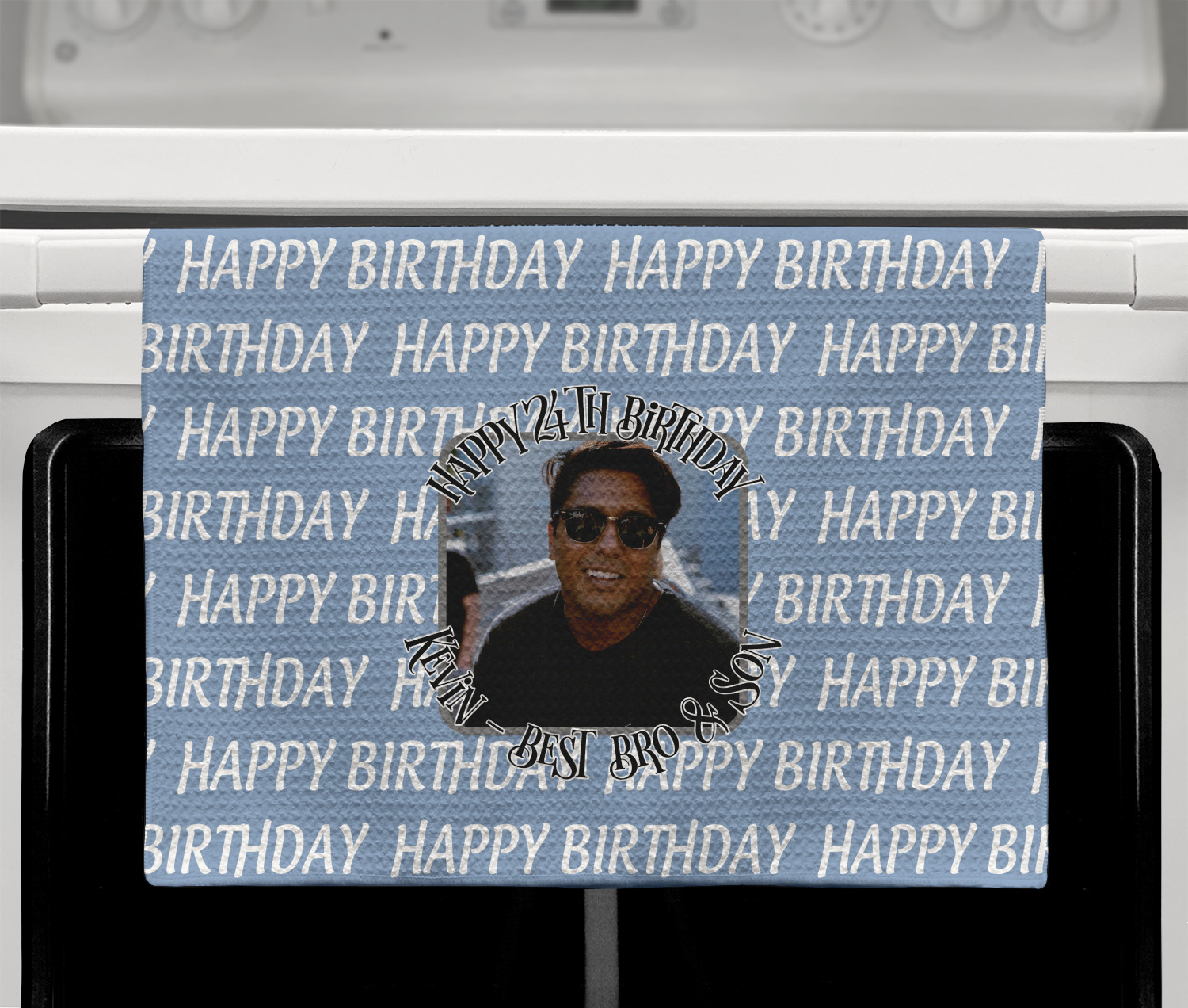 This design has a subtle background that says "Happy Birthday". You are able to upload your own picture of the birthday boy or girl right onto your design. The personalized text goes above and below your picture. This is a great design for pictures of you and the birthday boy/girl, so they can look at that cherished memory every day.