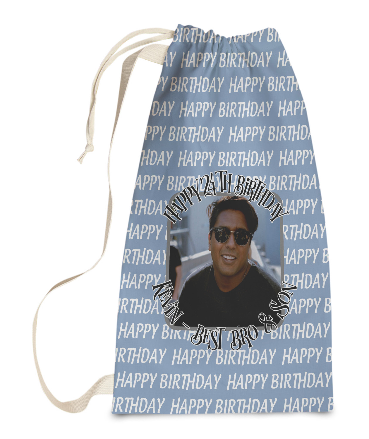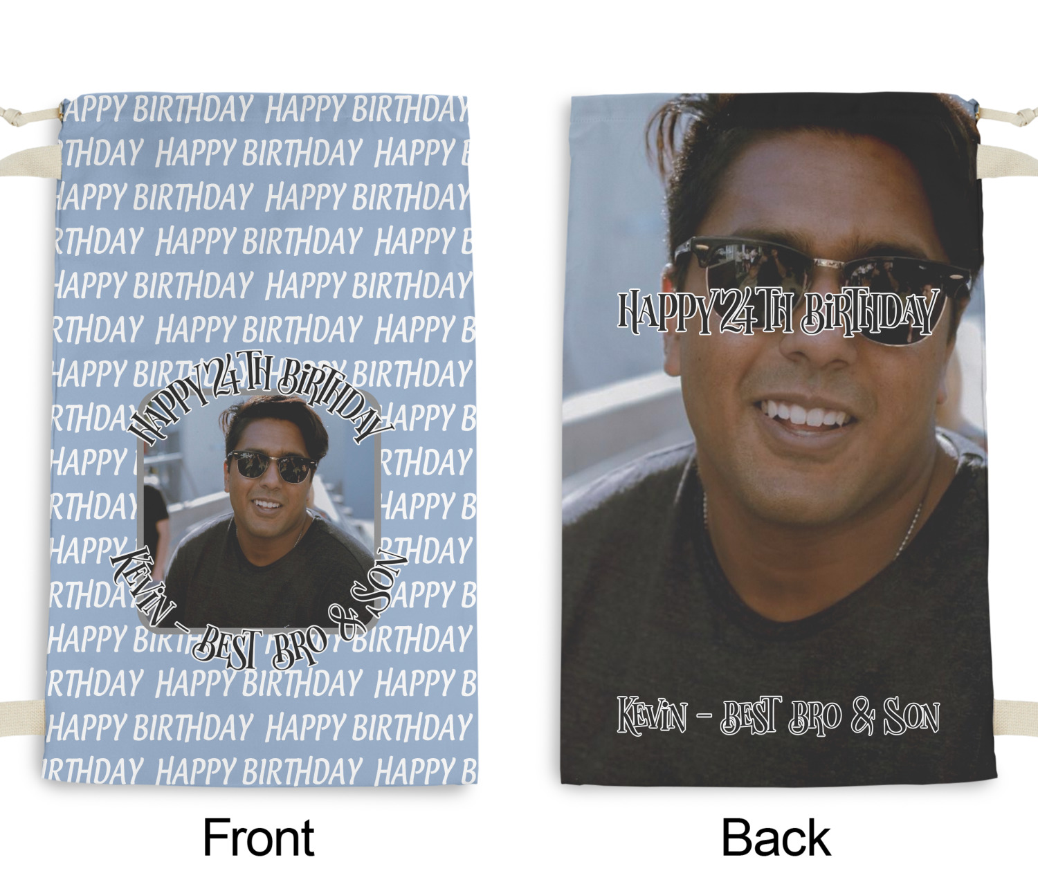 This design has a subtle background that says "Happy Birthday". You are able to upload your own picture of the birthday boy or girl right onto your design. The personalized text goes above and below your picture. This is a great design for pictures of you and the birthday boy/girl, so they can look at that cherished memory every day.