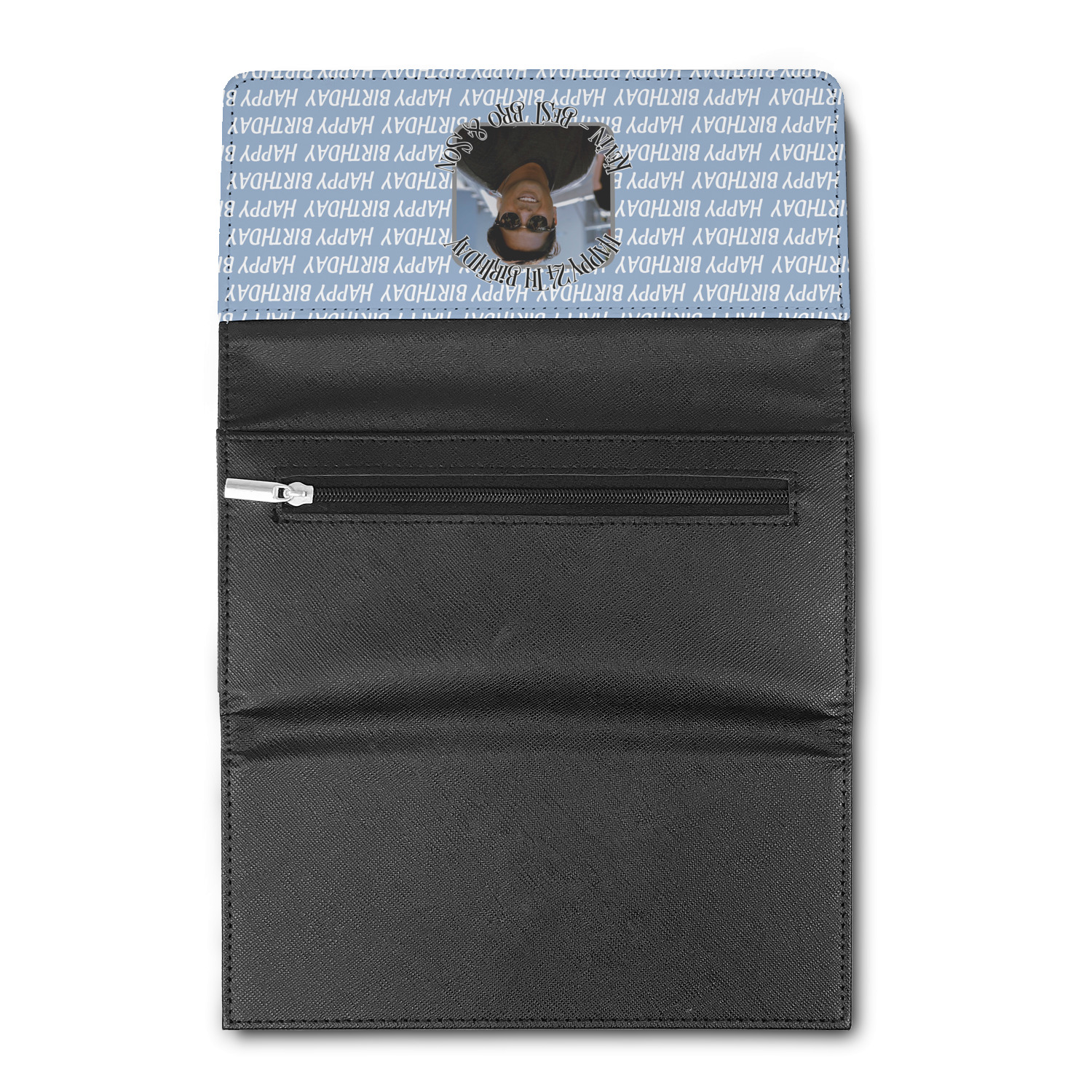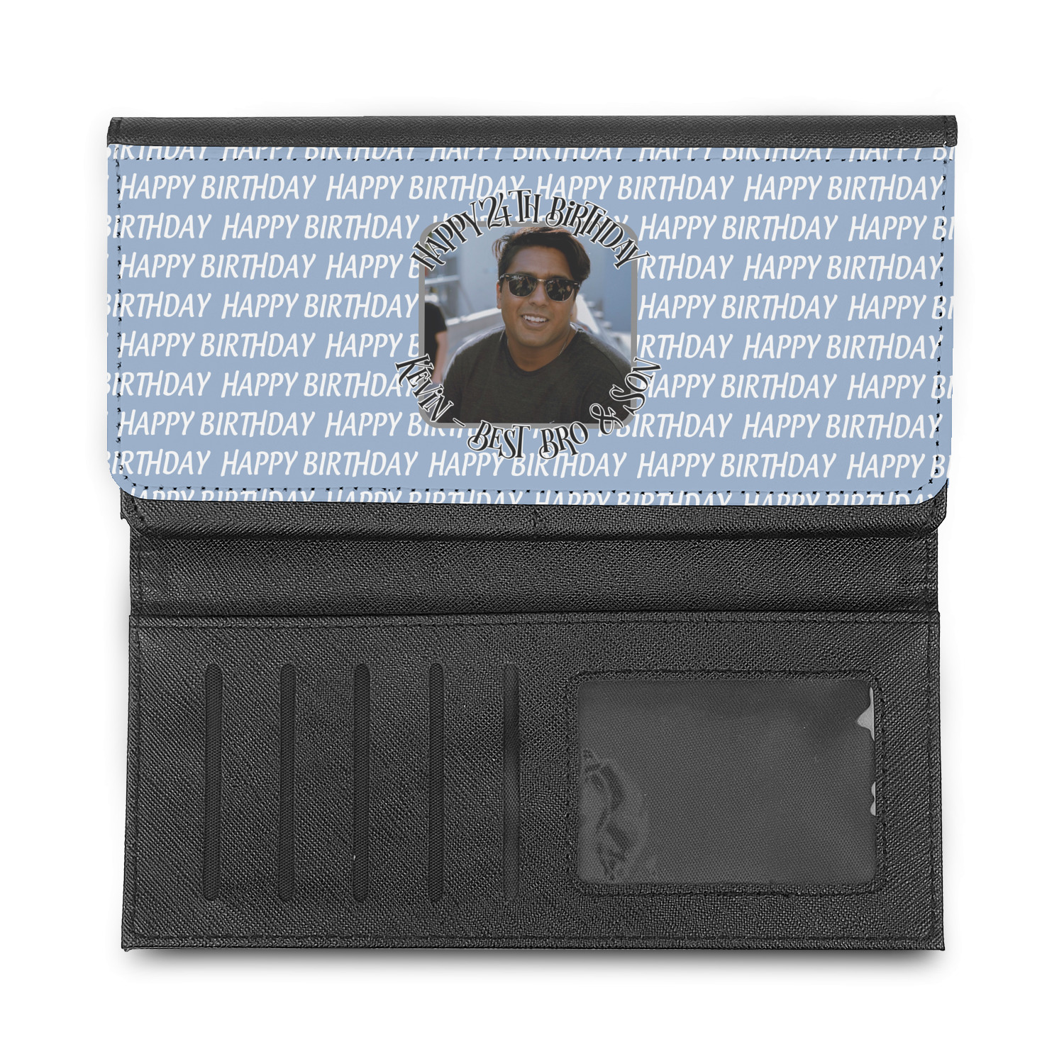 These beautiful wallets are a trifold design. The wallet is made of textured leatherette. The front section has a secure magnetic snap. The front flap is personalized with the artwork of your choice to make this wallet uniquely yours.
