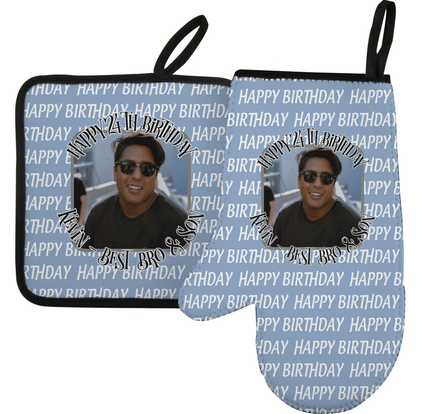 This design has a subtle background that says "Happy Birthday". You are able to upload your own picture of the birthday boy or girl right onto your design. The personalized text goes above and below your picture. This is a great design for pictures of you and the birthday boy/girl, so they can look at that cherished memory every day.