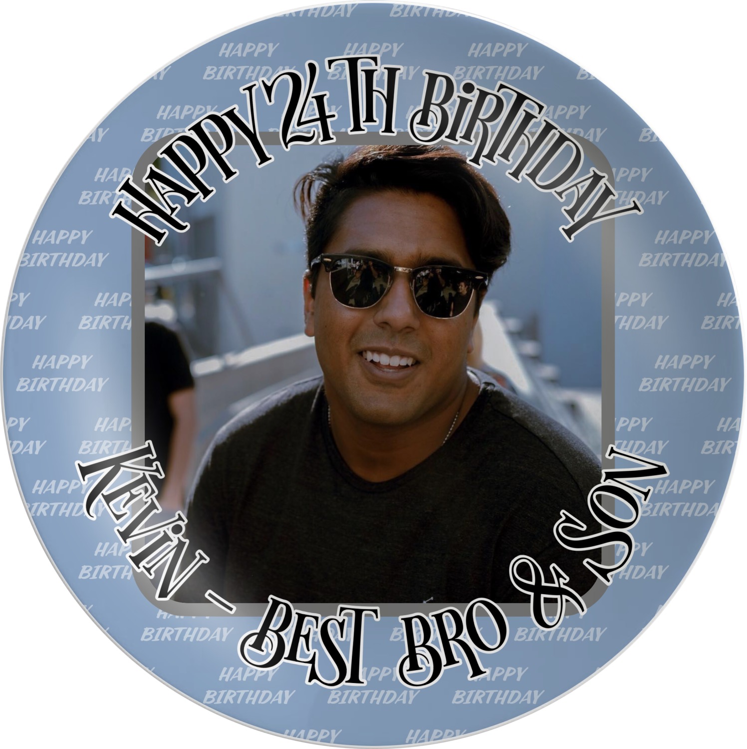 This design has a subtle background that says "Happy Birthday". You are able to upload your own picture of the birthday boy or girl right onto your design. The personalized text goes above and below your picture. This is a great design for pictures of you and the birthday boy/girl, so they can look at that cherished memory every day.