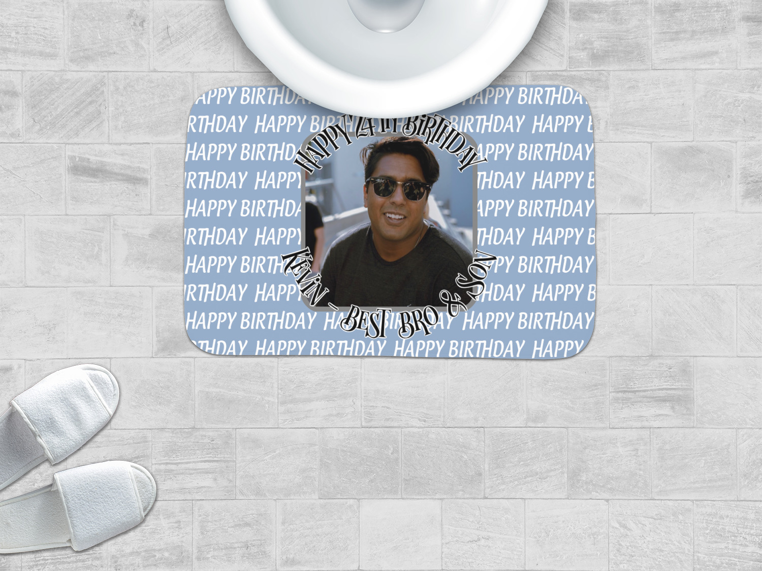 This design has a subtle background that says "Happy Birthday". You are able to upload your own picture of the birthday boy or girl right onto your design. The personalized text goes above and below your picture. This is a great design for pictures of you and the birthday boy/girl, so they can look at that cherished memory every day.