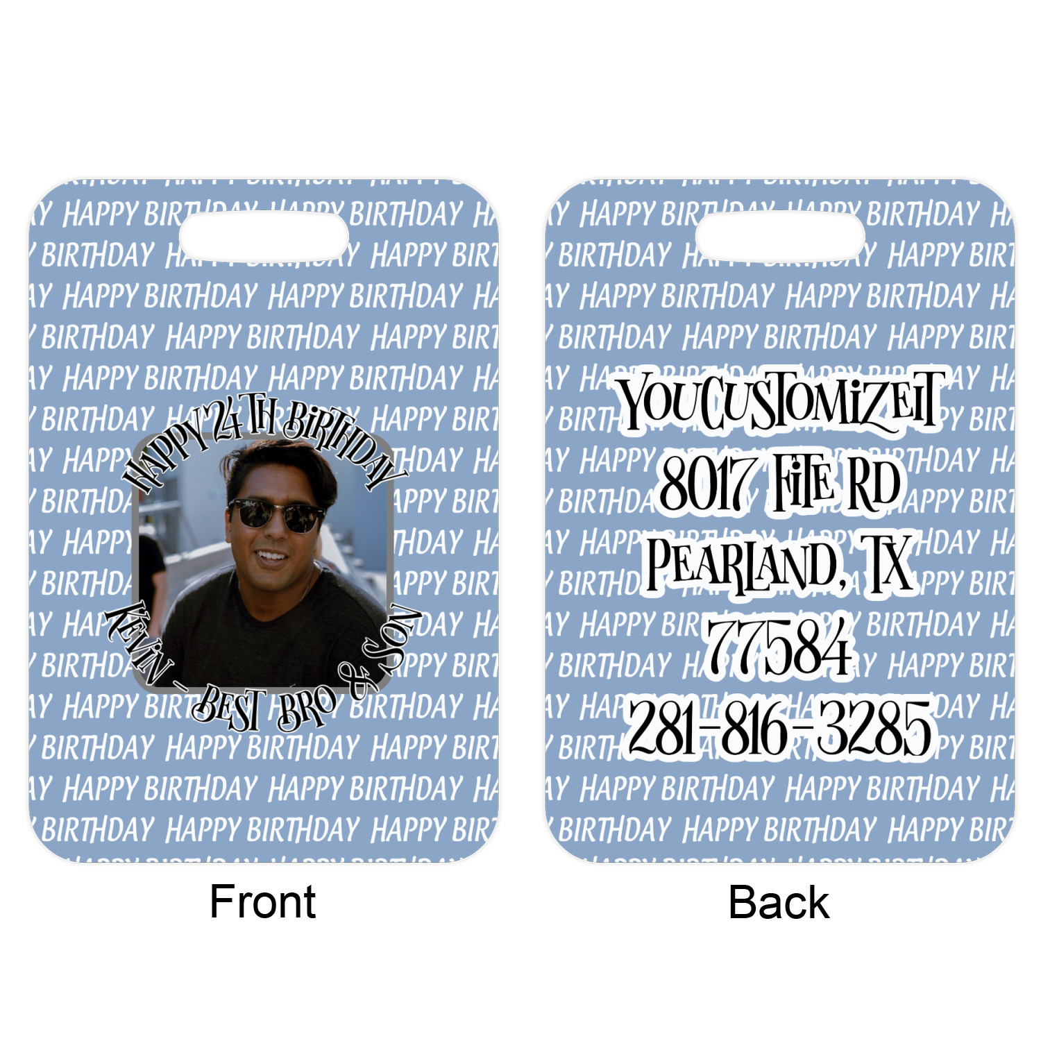 These metal luggage tags are printed on both sides; the front is printed with the design of your choice - and can be personalized with your name, name & initial or your monogram. The back can have as much or as little of your contact information as you desire - your name, your address, city, zip & state, you can also include your phone number and email address. Customize it exactly the way you want it!