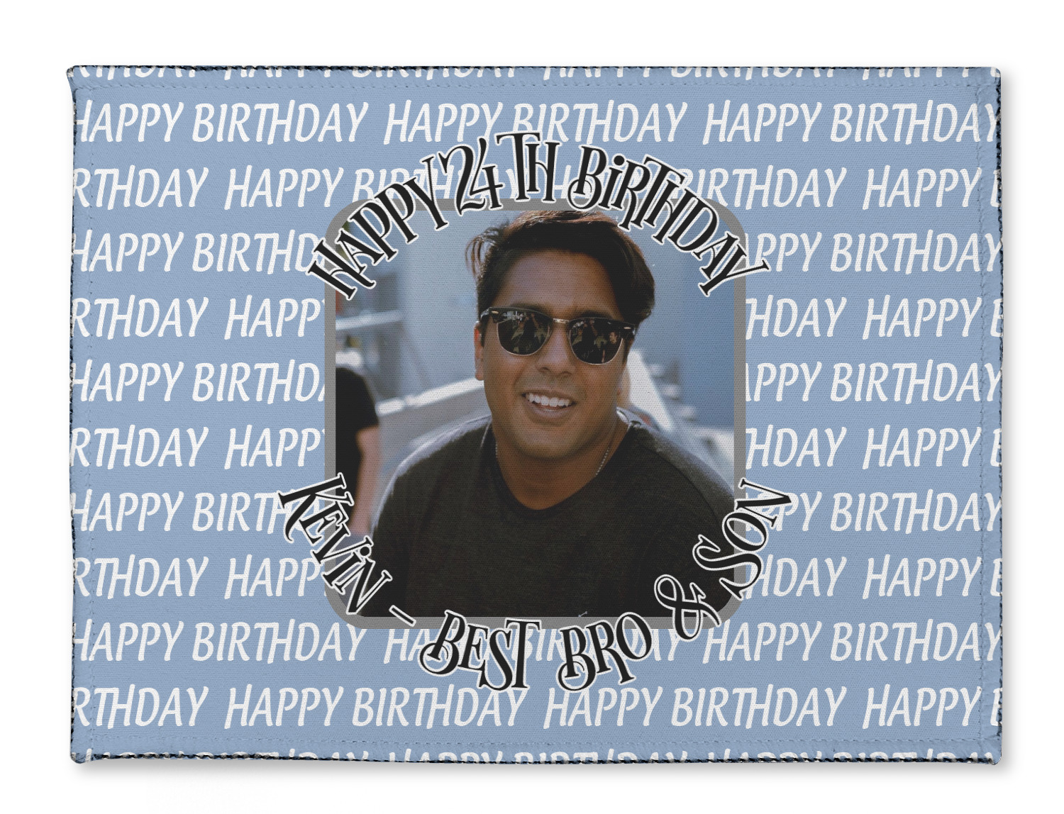 This design has a subtle background that says "Happy Birthday". You are able to upload your own picture of the birthday boy or girl right onto your design. The personalized text goes above and below your picture. This is a great design for pictures of you and the birthday boy/girl, so they can look at that cherished memory every day.