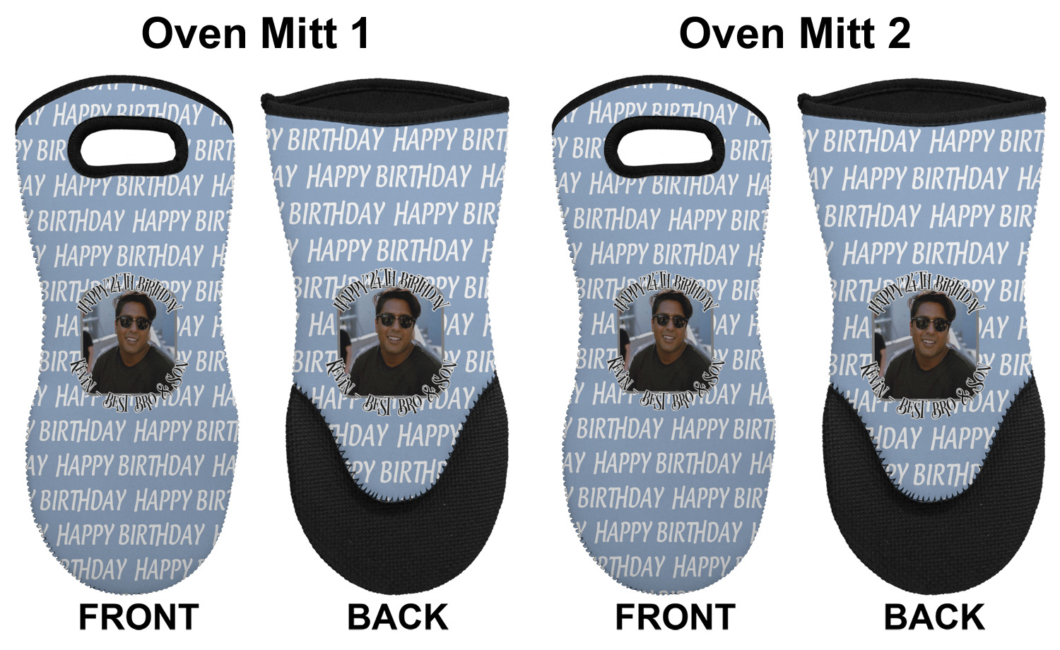 These heat resistant gloves are made entirely of a durable neoprene; the front features a softer texture, while the palm's side has a textured surface, meant to handle heat up to 500 degrees Fahrenheit. Thick, heavy duty stitching connects the two sides. A small, oval cutout appears on the front, and can be used to hang and store the mitt. Your personalization appears on the front, and the upper part of the back of the mitt. The style of these oven mitts are suitable for both the right and left hand, depending on your needs. If you need one for each hand, be sure to order two!