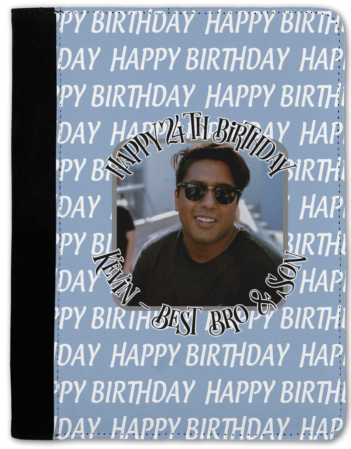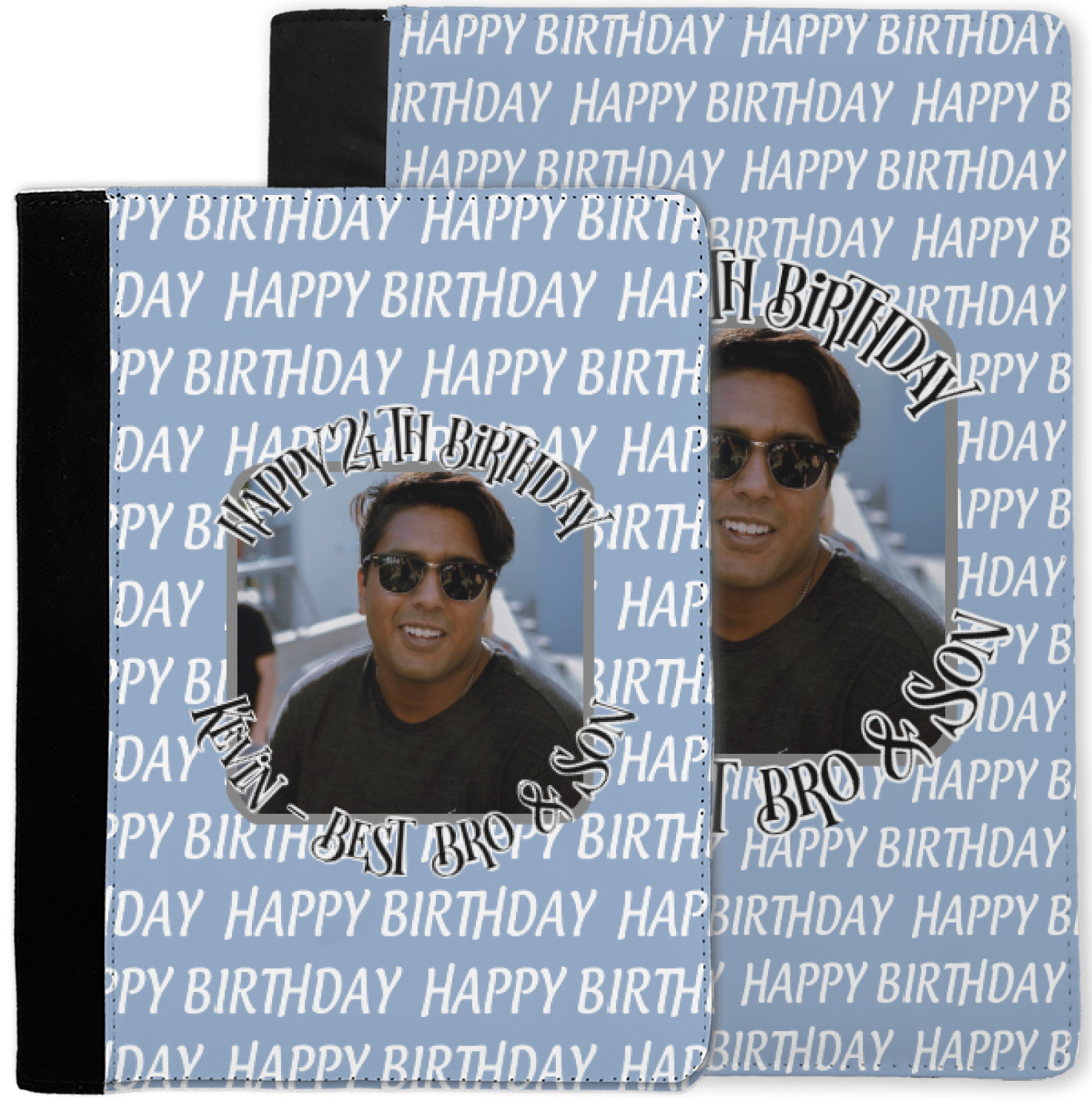 This design has a subtle background that says "Happy Birthday". You are able to upload your own picture of the birthday boy or girl right onto your design. The personalized text goes above and below your picture. This is a great design for pictures of you and the birthday boy/girl, so they can look at that cherished memory every day.