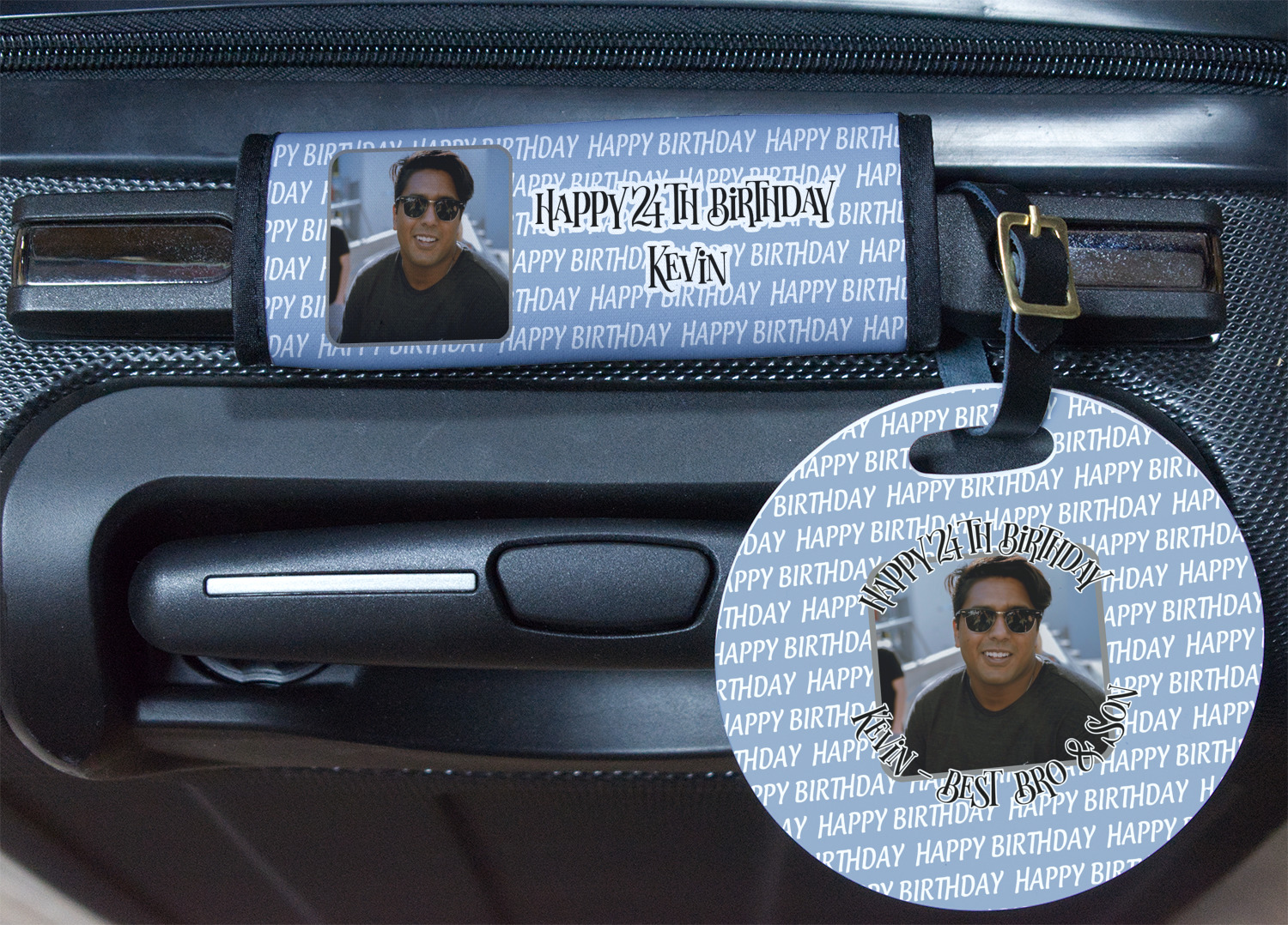 This design has a subtle background that says "Happy Birthday". You are able to upload your own picture of the birthday boy or girl right onto your design. The personalized text goes above and below your picture. This is a great design for pictures of you and the birthday boy/girl, so they can look at that cherished memory every day.