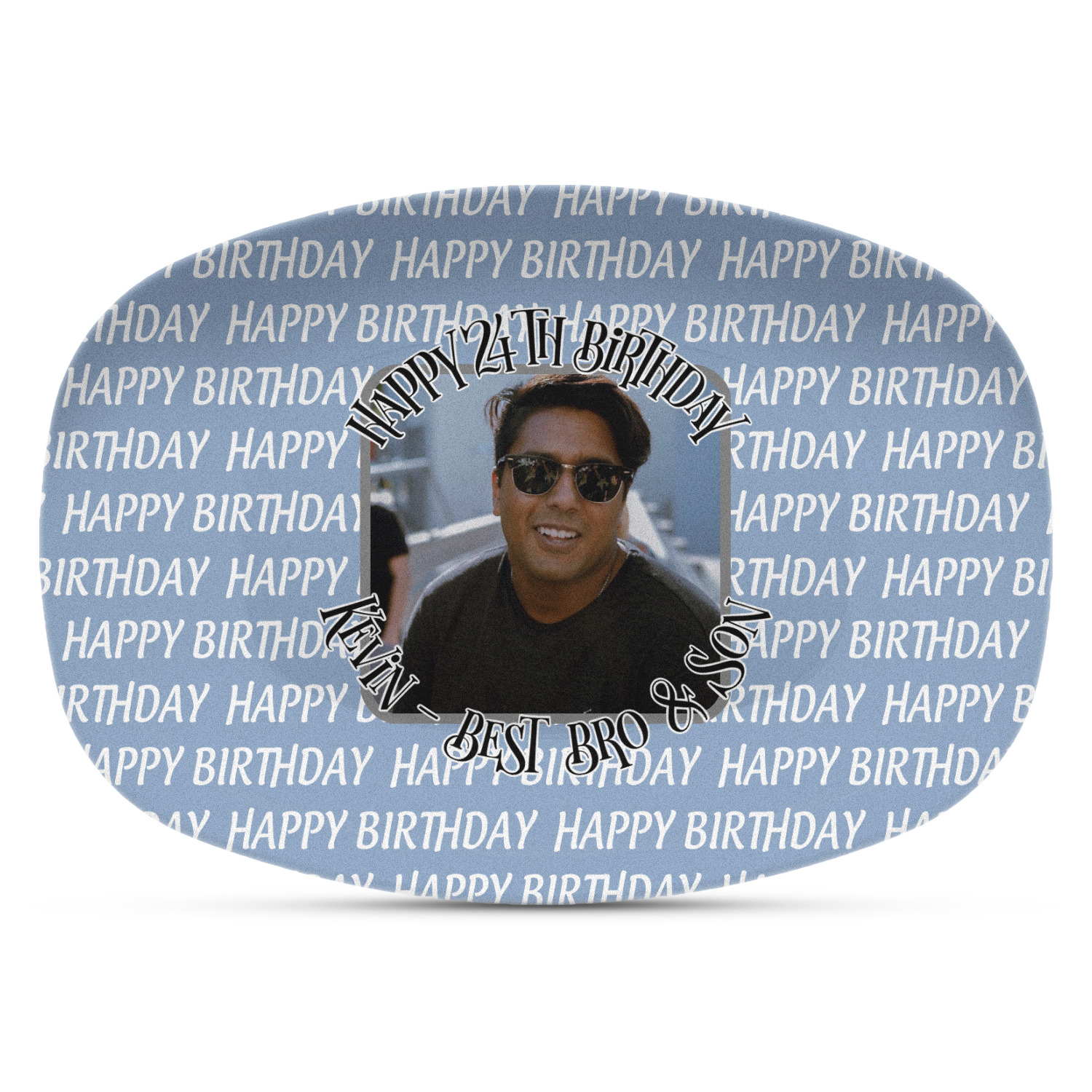 This design has a subtle background that says "Happy Birthday". You are able to upload your own picture of the birthday boy or girl right onto your design. The personalized text goes above and below your picture. This is a great design for pictures of you and the birthday boy/girl, so they can look at that cherished memory every day.