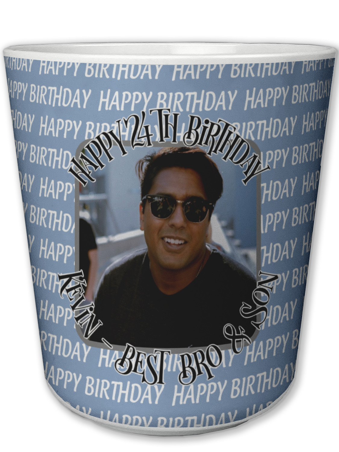 This design has a subtle background that says "Happy Birthday". You are able to upload your own picture of the birthday boy or girl right onto your design. The personalized text goes above and below your picture. This is a great design for pictures of you and the birthday boy/girl, so they can look at that cherished memory every day.