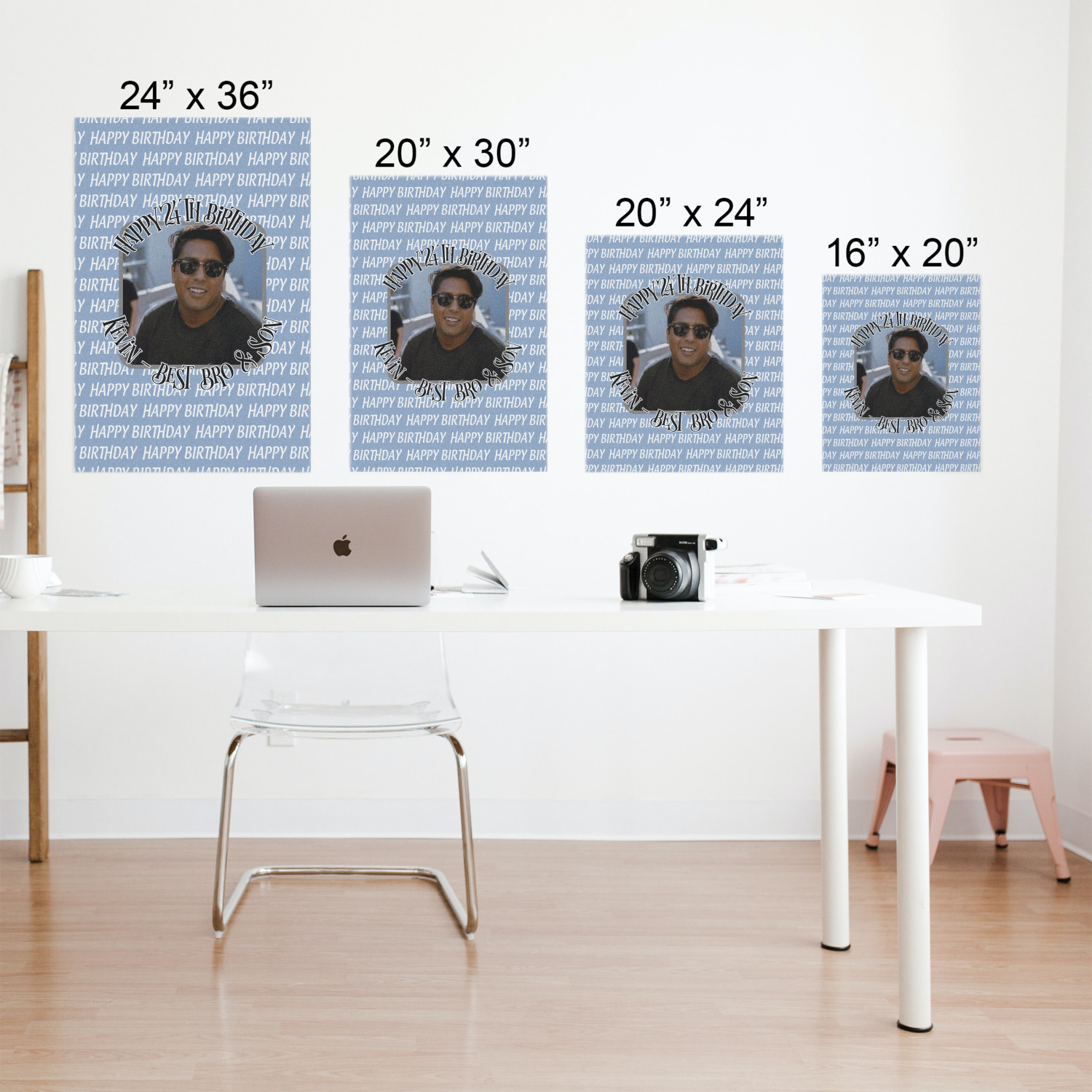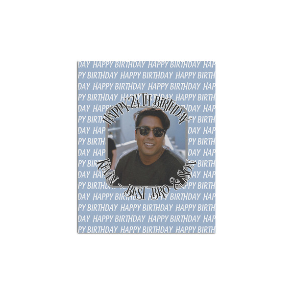 This design has a subtle background that says "Happy Birthday". You are able to upload your own picture of the birthday boy or girl right onto your design. The personalized text goes above and below your picture. This is a great design for pictures of you and the birthday boy/girl, so they can look at that cherished memory every day.