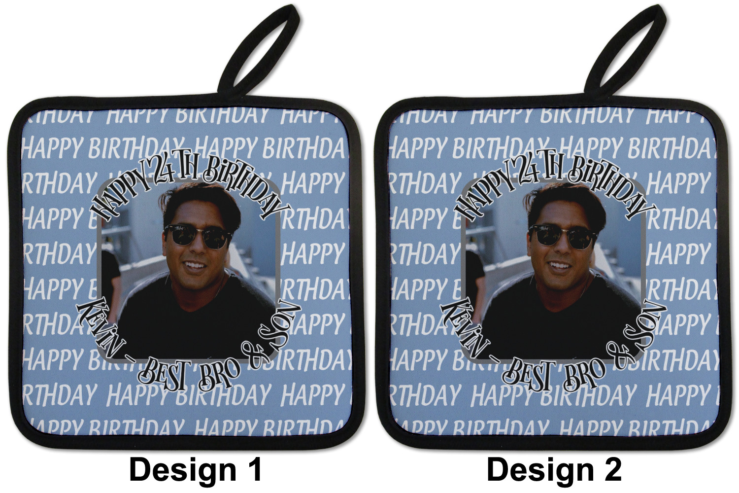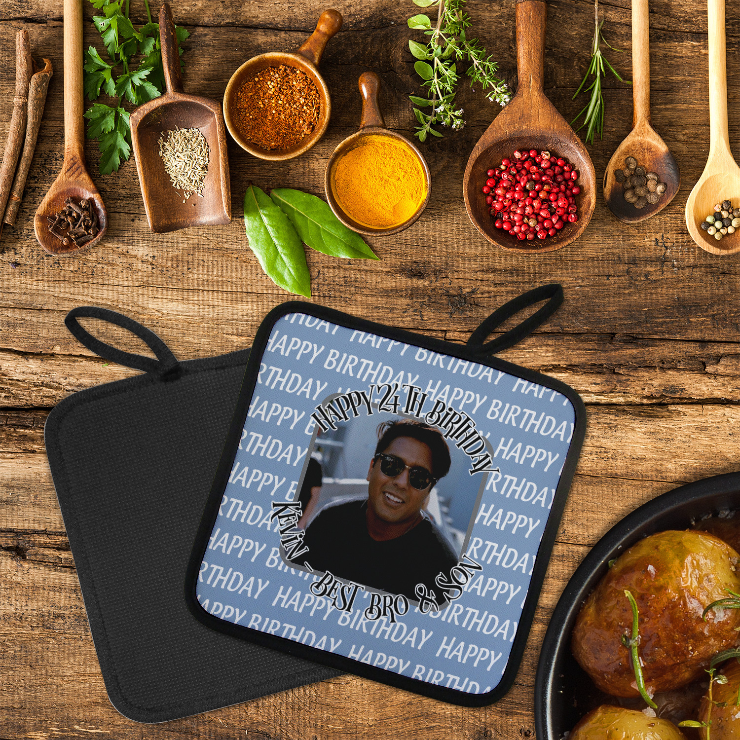 Our personalized pot holders feature a neoprene front that displays your personalization in vibrant colors. The backing of the hot pot holder is rubberized; the textured backing allows you to have a great grip when using this custom pot holder. The two materials are joined with a sleek, black trim, and the holder also includes an attached loop for hanging and storage. The pot holder is approximately 8.75 inches by 8.75 inches and 0.25 inches tall, while the fabric loop is 2.5 inches long. You can purchase a kitchen pot holder by itself or as a set of 2. We also offer a set including one pot holder and one oven mitt.