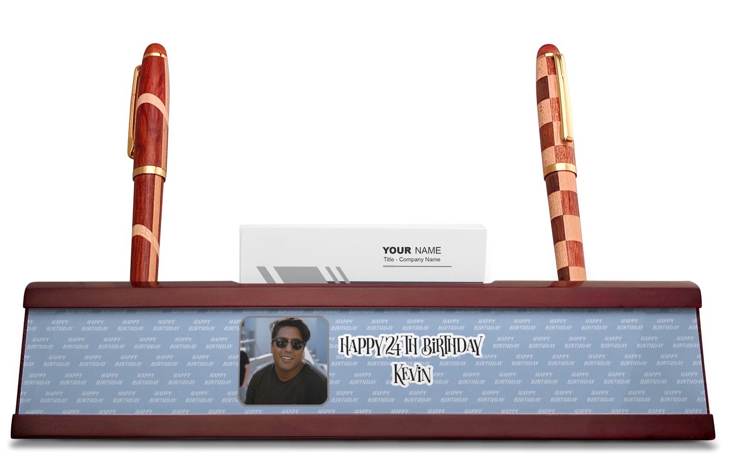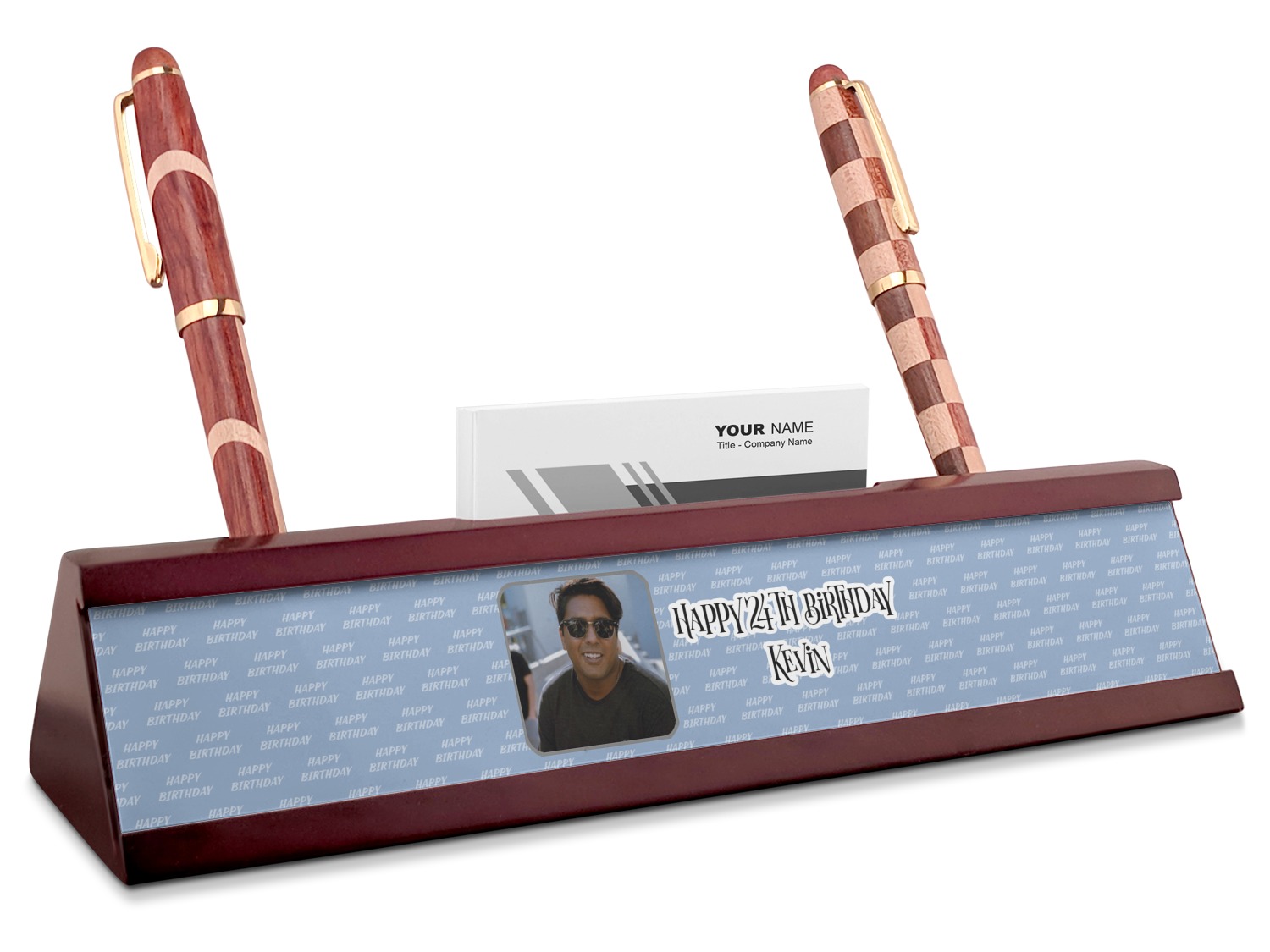 This design has a subtle background that says "Happy Birthday". You are able to upload your own picture of the birthday boy or girl right onto your design. The personalized text goes above and below your picture. This is a great design for pictures of you and the birthday boy/girl, so they can look at that cherished memory every day.