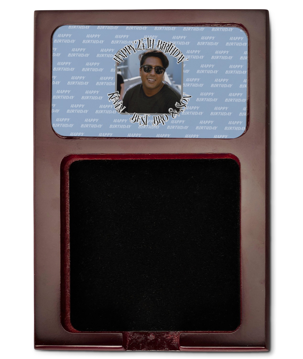 This design has a subtle background that says "Happy Birthday". You are able to upload your own picture of the birthday boy or girl right onto your design. The personalized text goes above and below your picture. This is a great design for pictures of you and the birthday boy/girl, so they can look at that cherished memory every day.