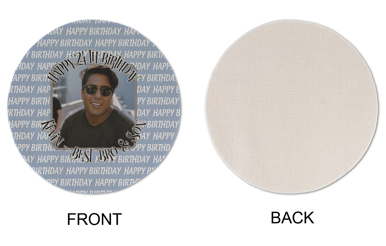 This design has a subtle background that says "Happy Birthday". You are able to upload your own picture of the birthday boy or girl right onto your design. The personalized text goes above and below your picture. This is a great design for pictures of you and the birthday boy/girl, so they can look at that cherished memory every day.