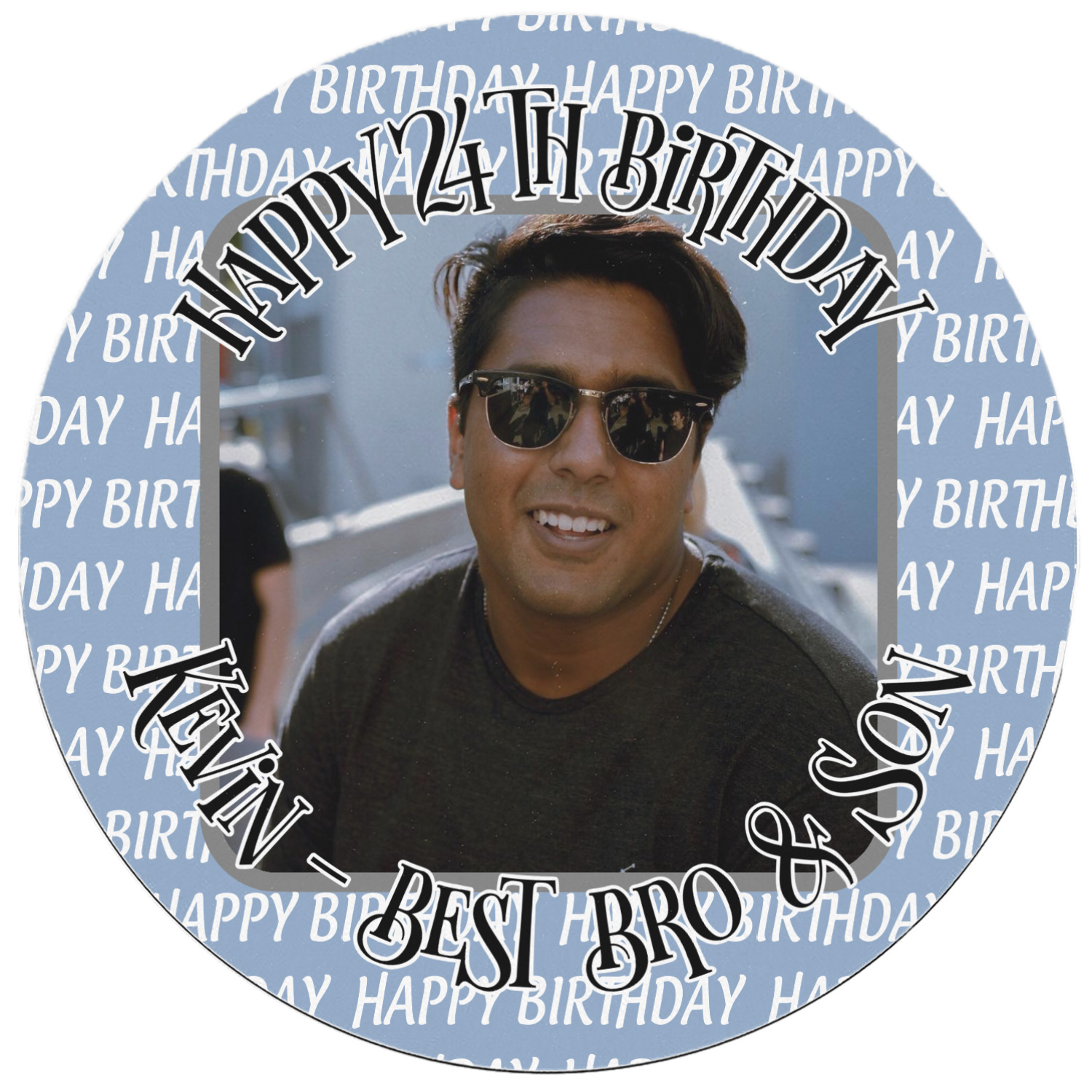 This design has a subtle background that says "Happy Birthday". You are able to upload your own picture of the birthday boy or girl right onto your design. The personalized text goes above and below your picture. This is a great design for pictures of you and the birthday boy/girl, so they can look at that cherished memory every day.