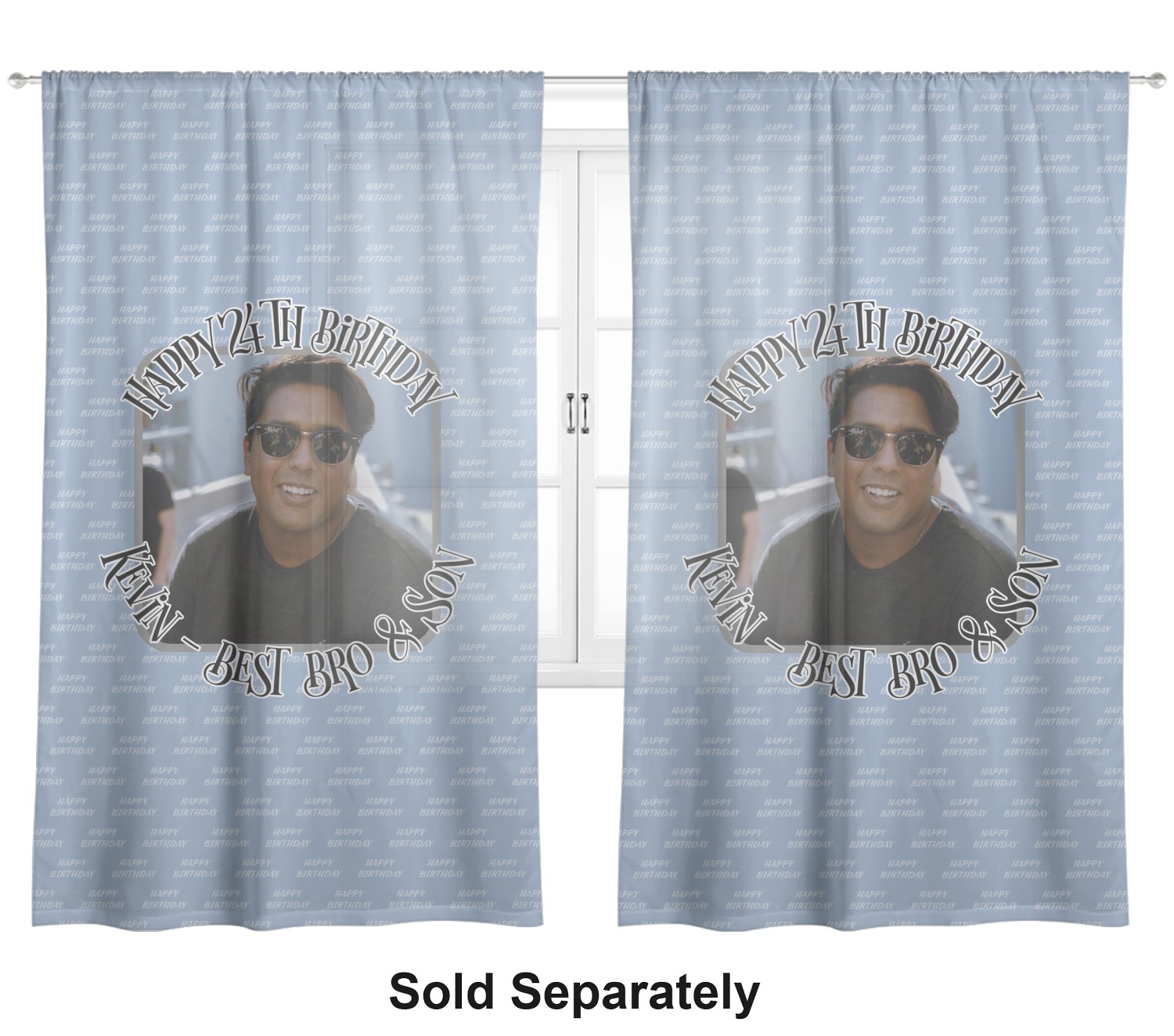 This design has a subtle background that says "Happy Birthday". You are able to upload your own picture of the birthday boy or girl right onto your design. The personalized text goes above and below your picture. This is a great design for pictures of you and the birthday boy/girl, so they can look at that cherished memory every day.