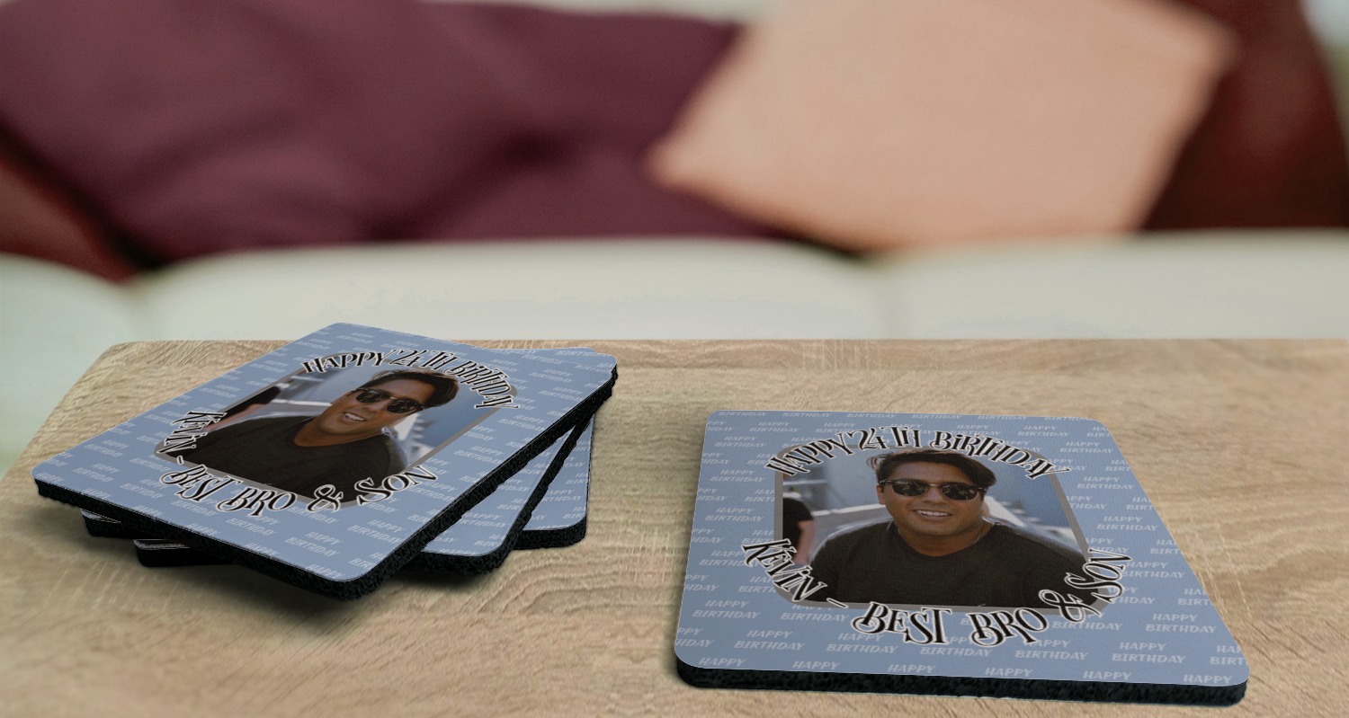These drink coasters have a smooth, polyester top and a textured, rubber backing on its bottom. The non-slip rubber backing underneath works to keep any spills at bay. At 4 by 4 by 0.25 inches thick, these custom coasters are a suitable size for most drinkware. Your personalization is displayed atop the face of the cup coaster. We sell these rubber coasters in two different shapes: square and round. You can buy each shape as singulars or as a set of 4.