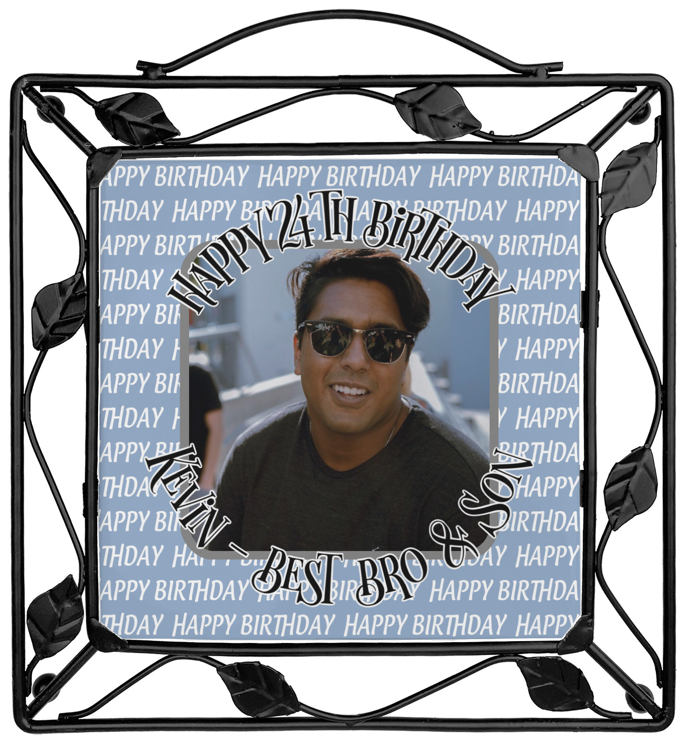 This design has a subtle background that says "Happy Birthday". You are able to upload your own picture of the birthday boy or girl right onto your design. The personalized text goes above and below your picture. This is a great design for pictures of you and the birthday boy/girl, so they can look at that cherished memory every day.