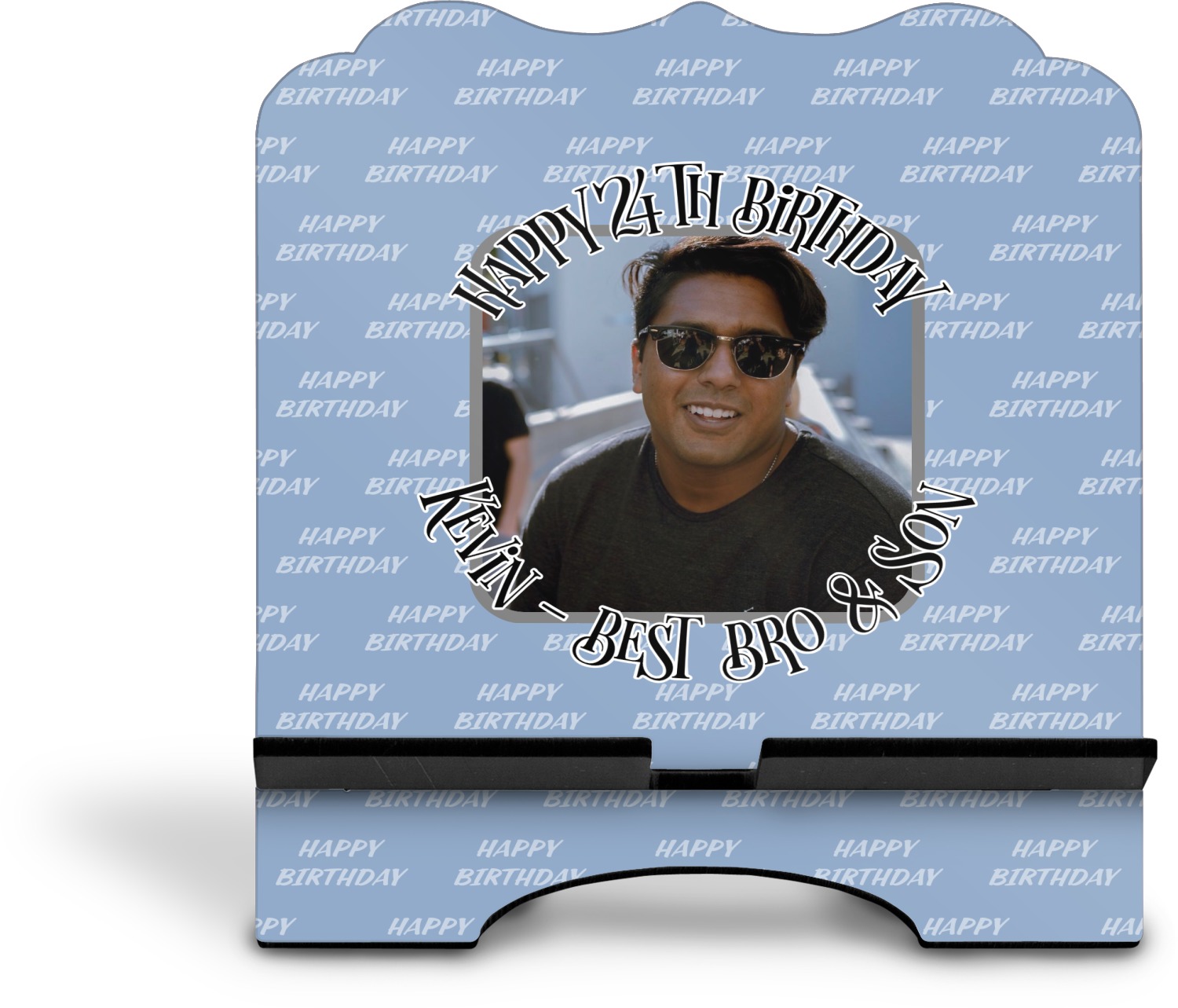 This design has a subtle background that says "Happy Birthday". You are able to upload your own picture of the birthday boy or girl right onto your design. The personalized text goes above and below your picture. This is a great design for pictures of you and the birthday boy/girl, so they can look at that cherished memory every day.