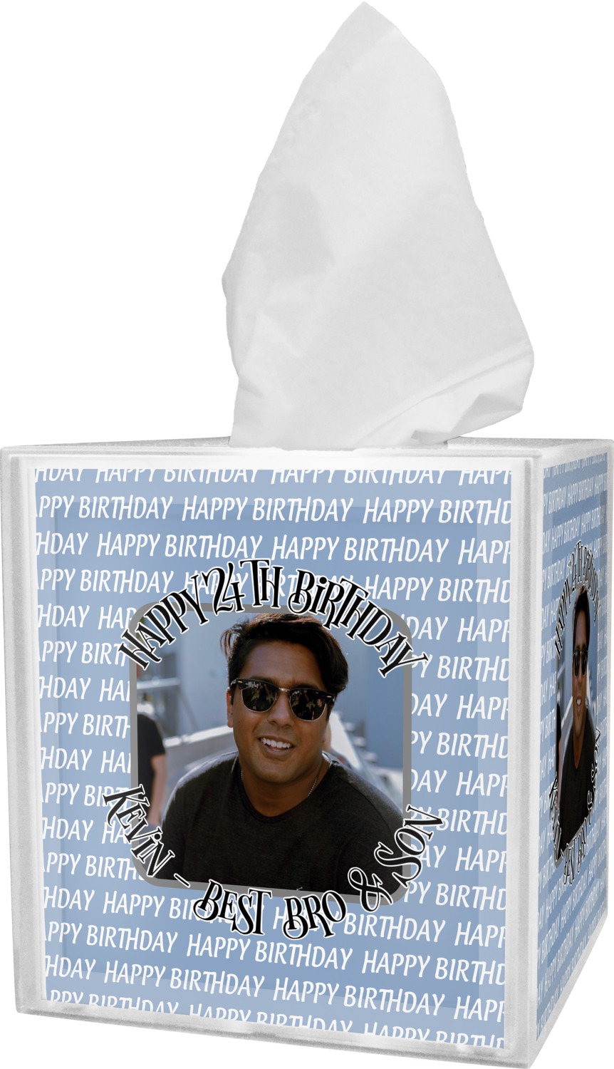 These tissue holders are built from durable acrylic and display your unique personalization on fine-quality vinyl inserts placed within the four sides and top. The box features two pieces, allowing you to easily switch out tissue boxes. On the sides, youll find ridges that ensure the top and base fit securely in place. The bottom of these tissue box holders has four, rubber, non-slip pads to prevent the box from scuffing any surface you decide to display it on. Each box can fit a standard 5 by 5-inch box of tissues.