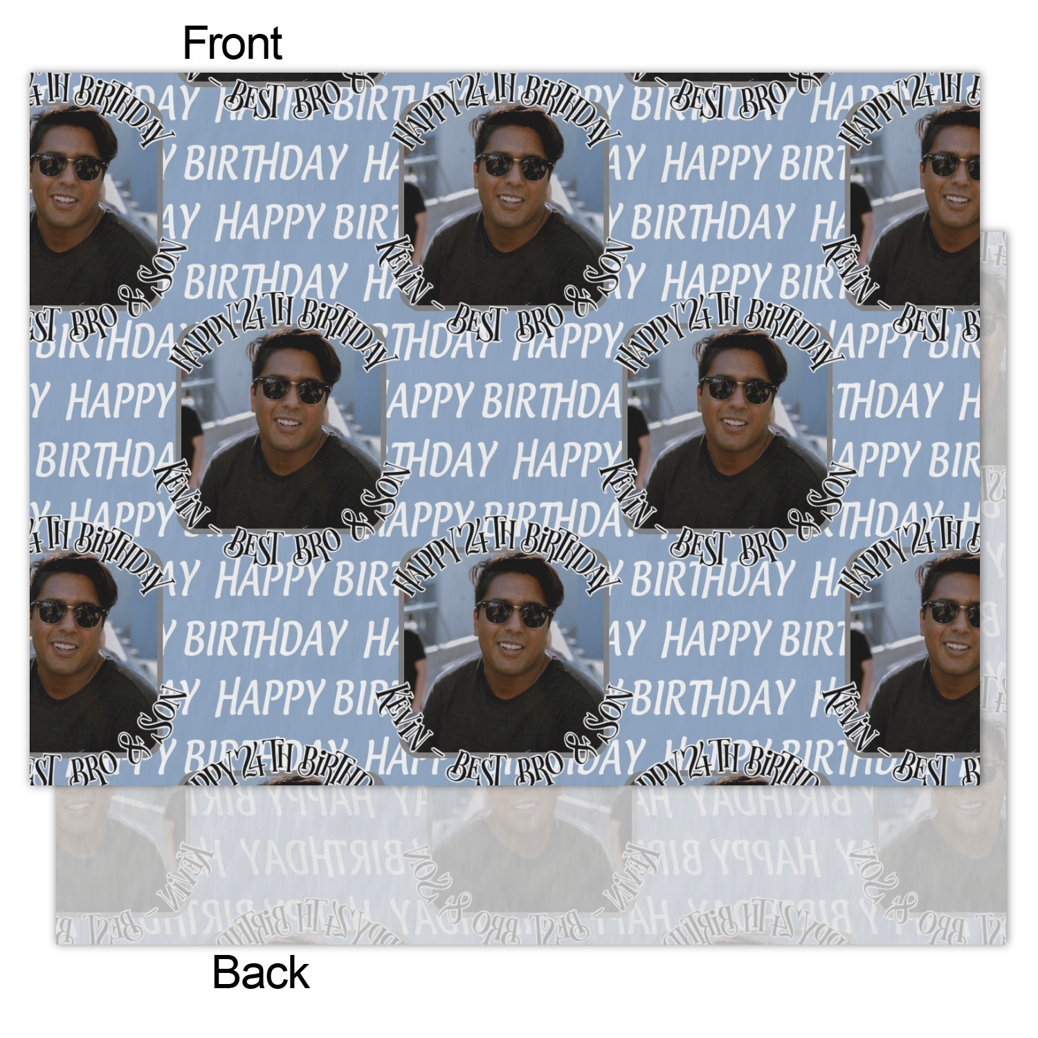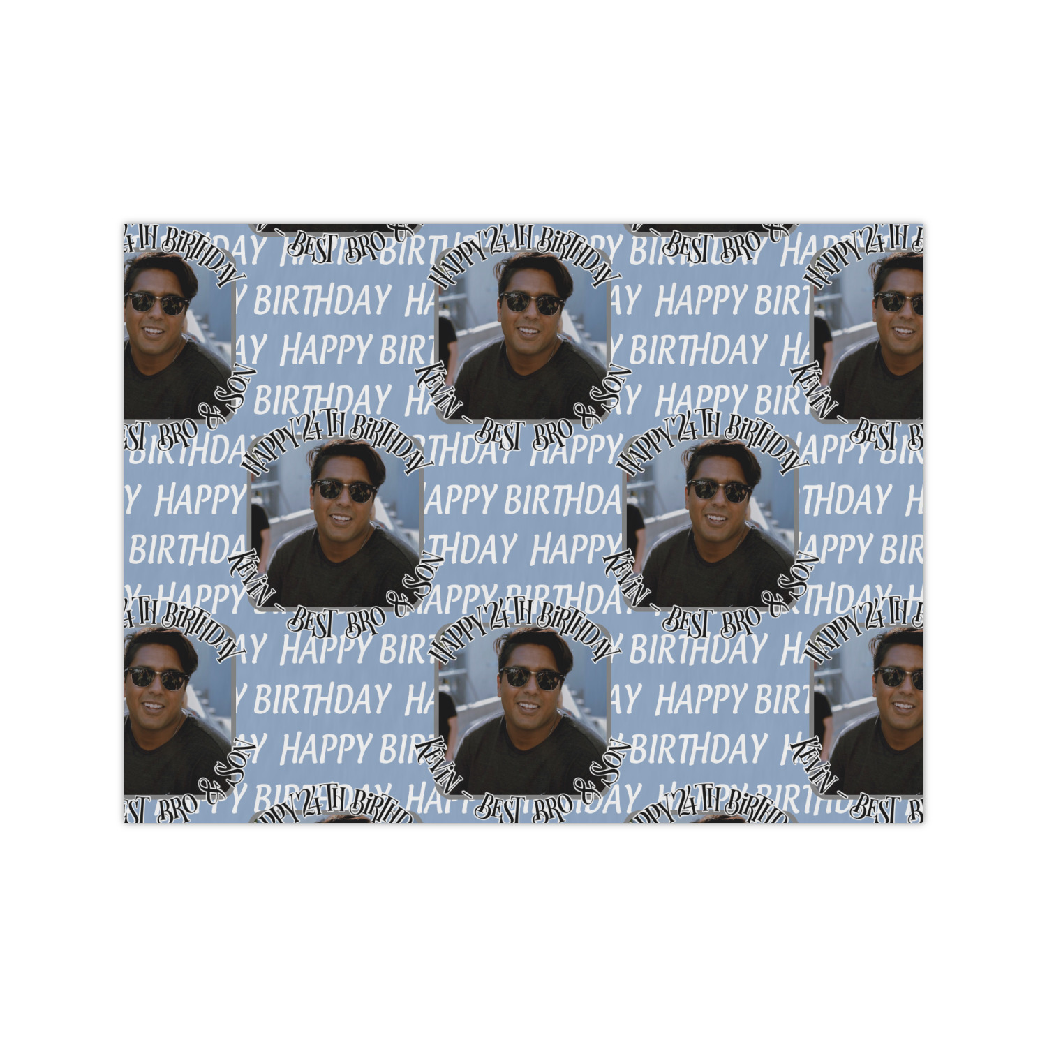 This design has a subtle background that says "Happy Birthday". You are able to upload your own picture of the birthday boy or girl right onto your design. The personalized text goes above and below your picture. This is a great design for pictures of you and the birthday boy/girl, so they can look at that cherished memory every day.