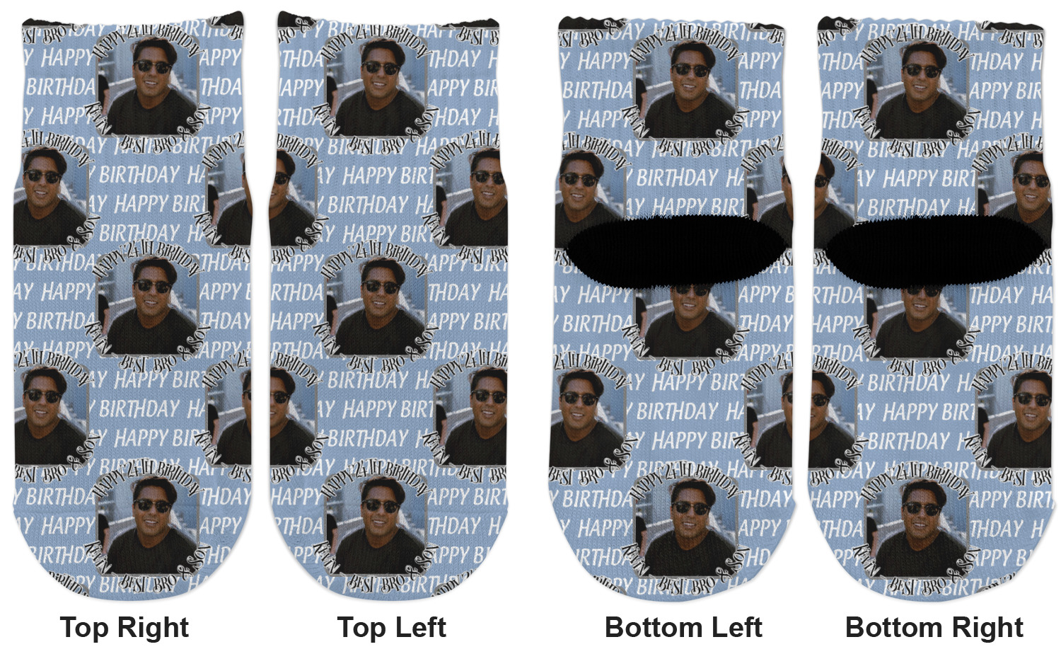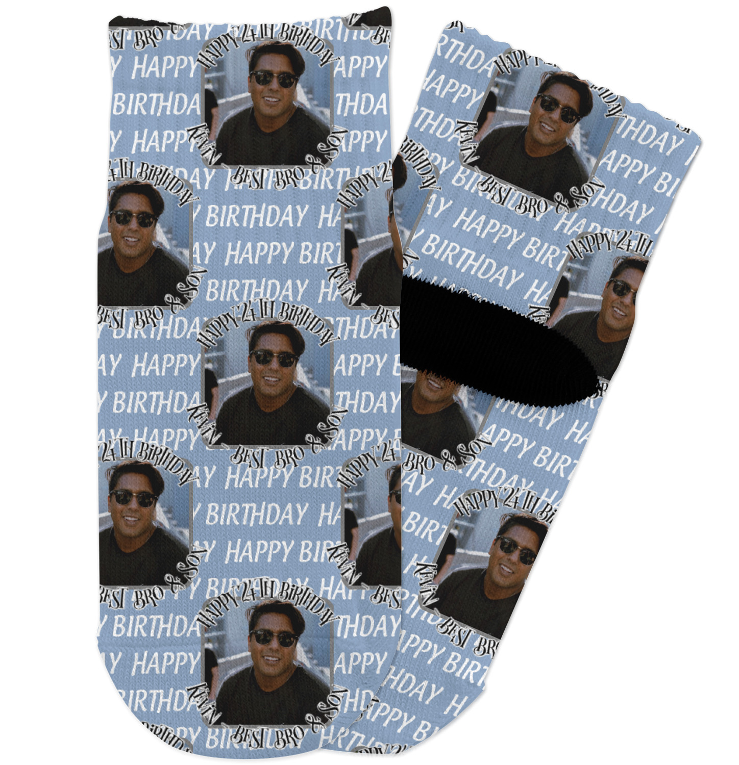 This design has a subtle background that says "Happy Birthday". You are able to upload your own picture of the birthday boy or girl right onto your design. The personalized text goes above and below your picture. This is a great design for pictures of you and the birthday boy/girl, so they can look at that cherished memory every day.