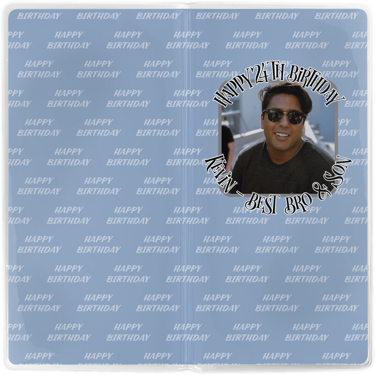 This design has a subtle background that says "Happy Birthday". You are able to upload your own picture of the birthday boy or girl right onto your design. The personalized text goes above and below your picture. This is a great design for pictures of you and the birthday boy/girl, so they can look at that cherished memory every day.