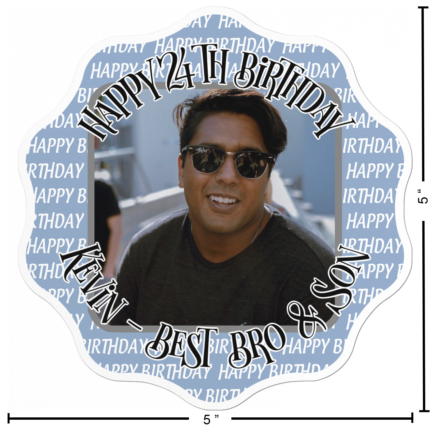 This design has a subtle background that says "Happy Birthday". You are able to upload your own picture of the birthday boy or girl right onto your design. The personalized text goes above and below your picture. This is a great design for pictures of you and the birthday boy/girl, so they can look at that cherished memory every day.