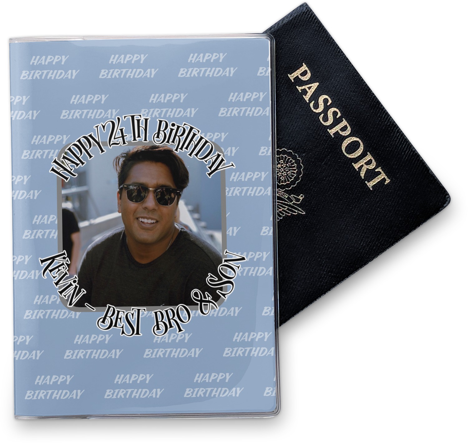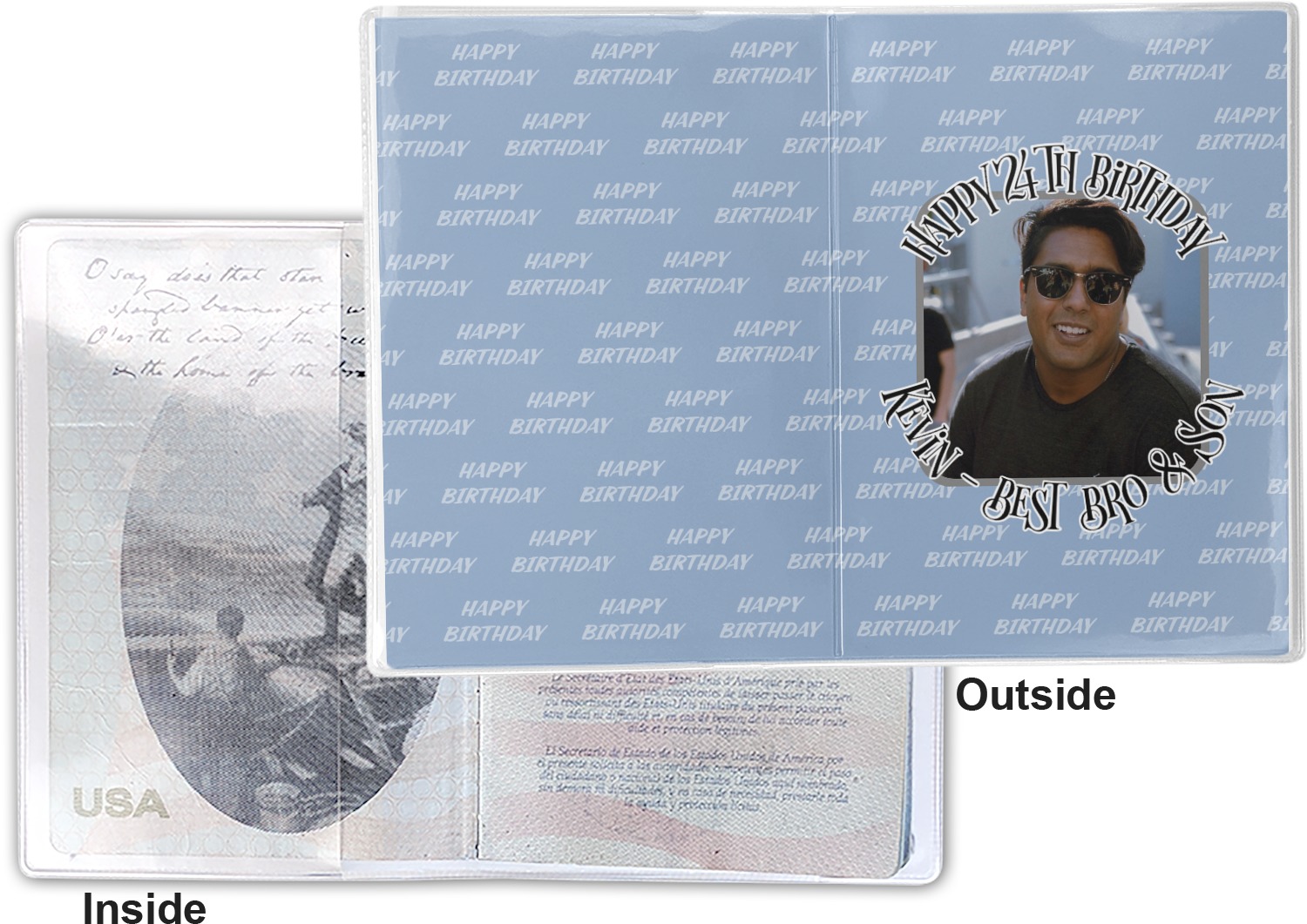 This cover is made of a sturdy clear vinyl with a personalized vinyl insert inside. There is a large and a small pocket on either side to hold the covers of your passport easily and firmly. The passport holder is approximately 7.5" x 5.25", the perfect size to snugly fit your passport. This slim cover is the perfect way to protect your passport without being one more bulky item you have to carry.