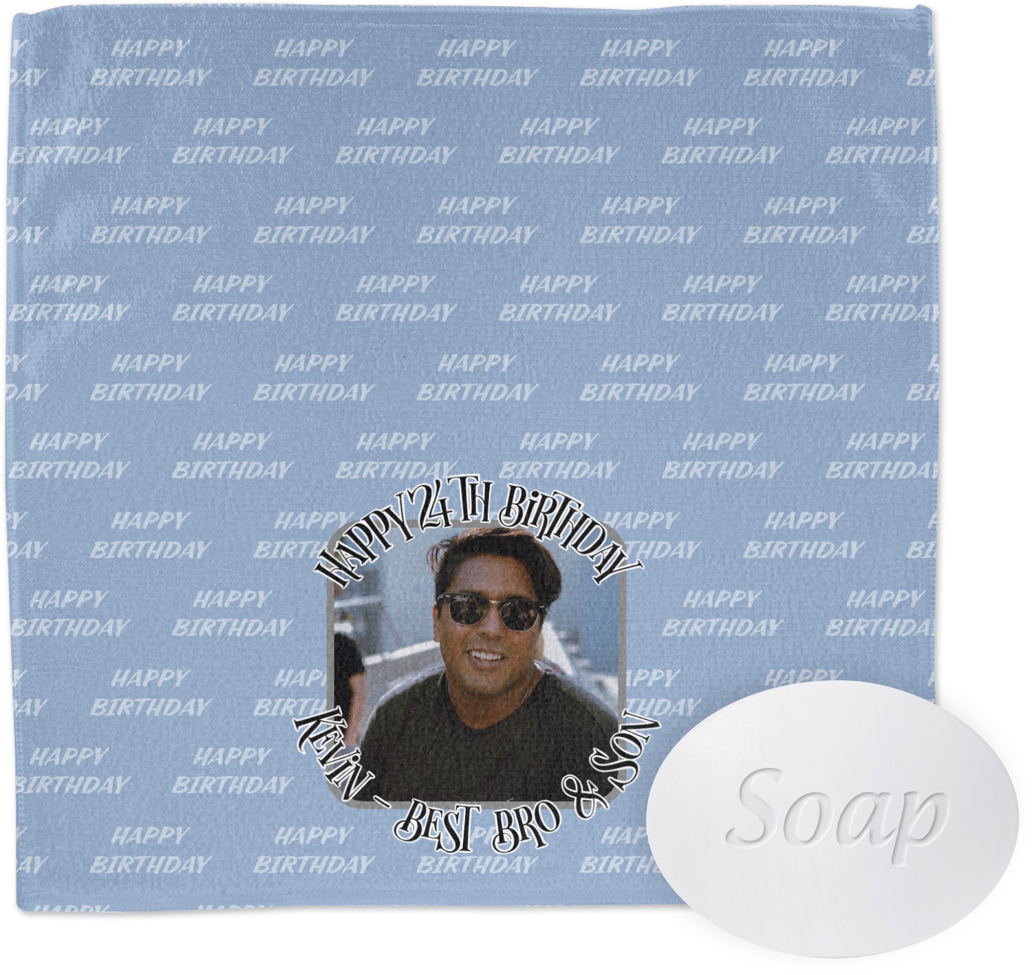 This design has a subtle background that says "Happy Birthday". You are able to upload your own picture of the birthday boy or girl right onto your design. The personalized text goes above and below your picture. This is a great design for pictures of you and the birthday boy/girl, so they can look at that cherished memory every day.