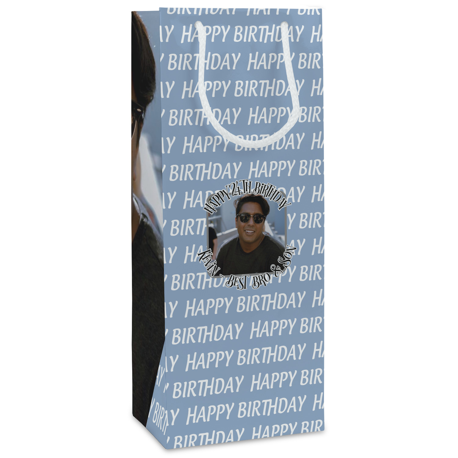 This design has a subtle background that says "Happy Birthday". You are able to upload your own picture of the birthday boy or girl right onto your design. The personalized text goes above and below your picture. This is a great design for pictures of you and the birthday boy/girl, so they can look at that cherished memory every day.