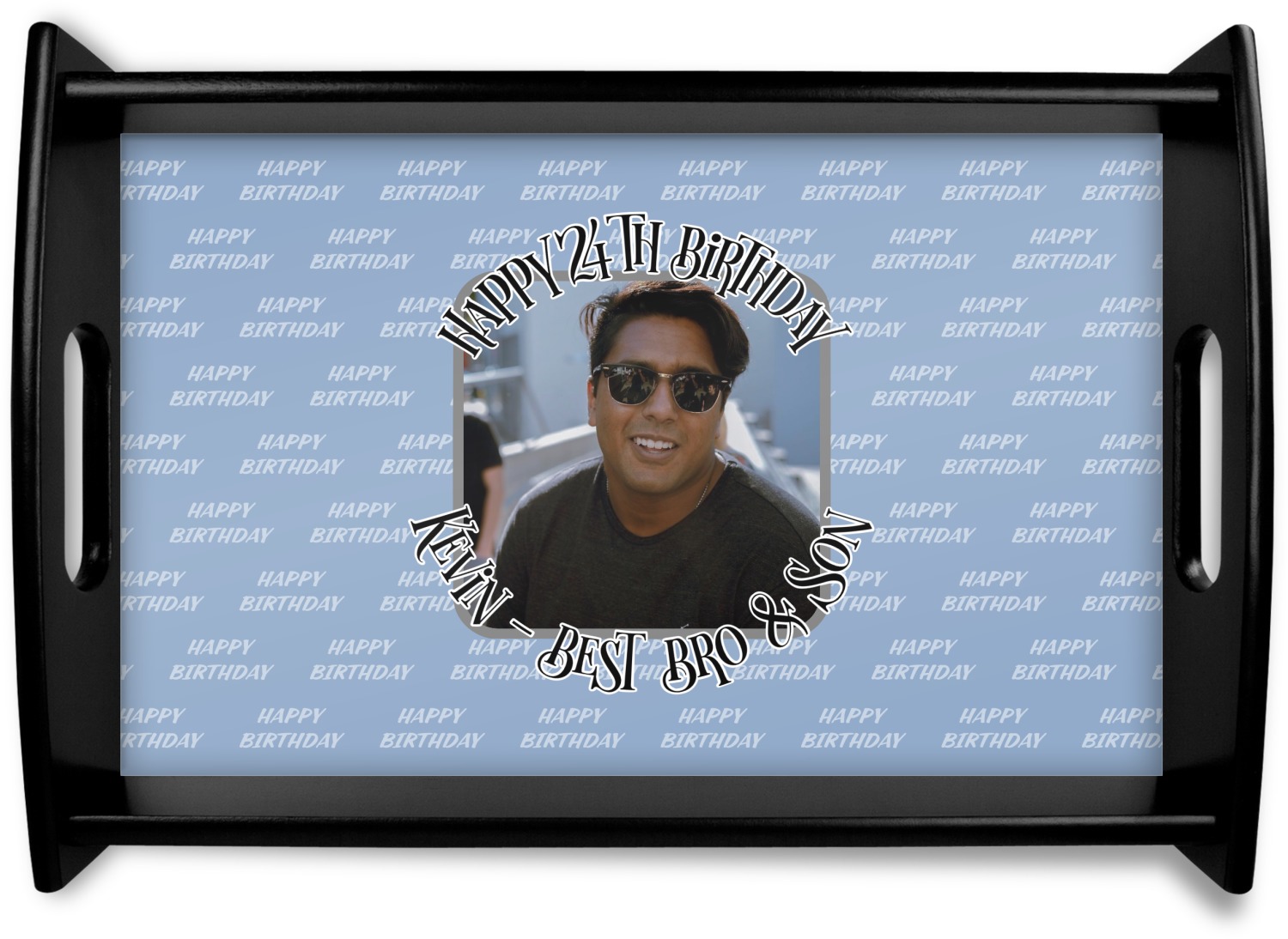 This design has a subtle background that says "Happy Birthday". You are able to upload your own picture of the birthday boy or girl right onto your design. The personalized text goes above and below your picture. This is a great design for pictures of you and the birthday boy/girl, so they can look at that cherished memory every day.