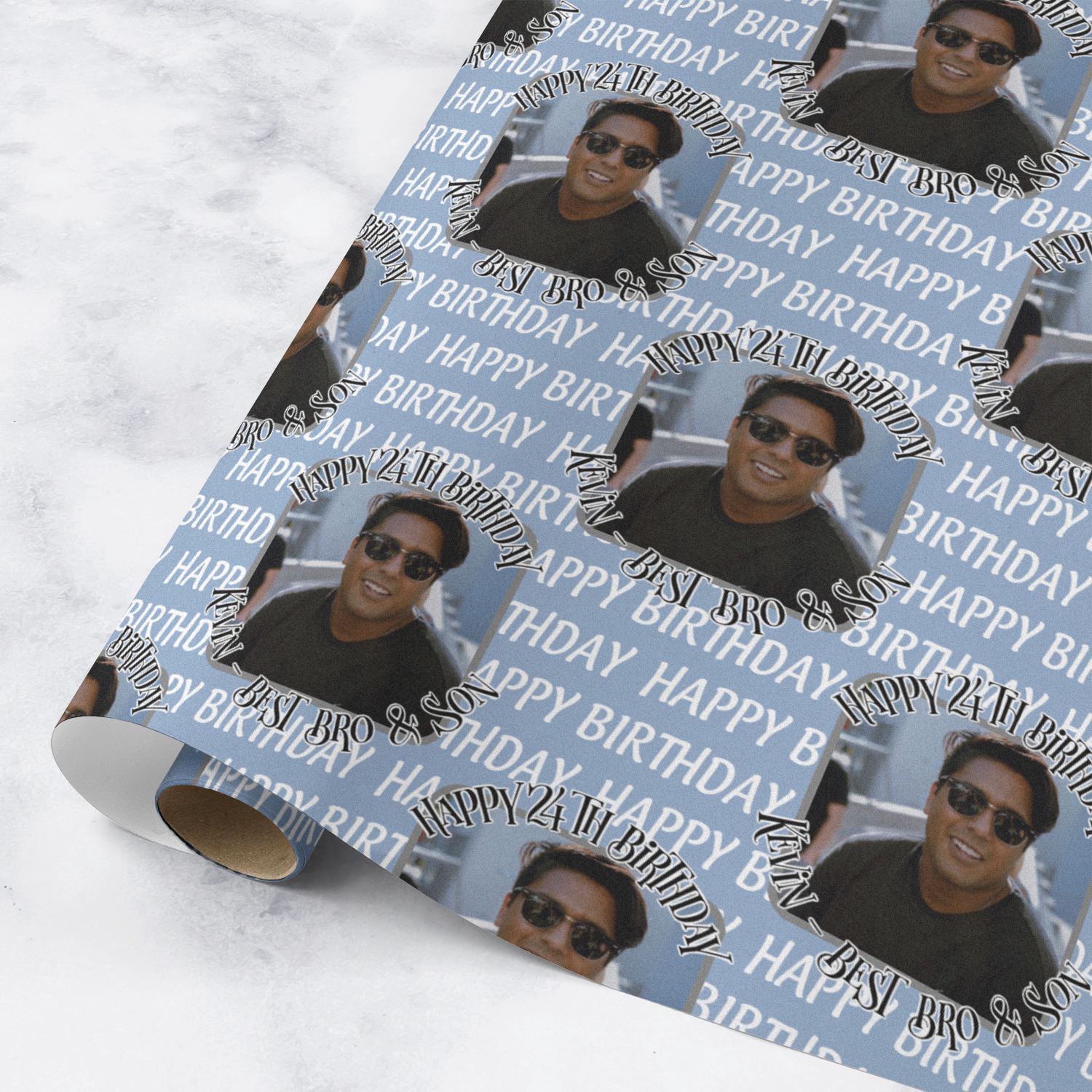 This design has a subtle background that says "Happy Birthday". You are able to upload your own picture of the birthday boy or girl right onto your design. The personalized text goes above and below your picture. This is a great design for pictures of you and the birthday boy/girl, so they can look at that cherished memory every day.
