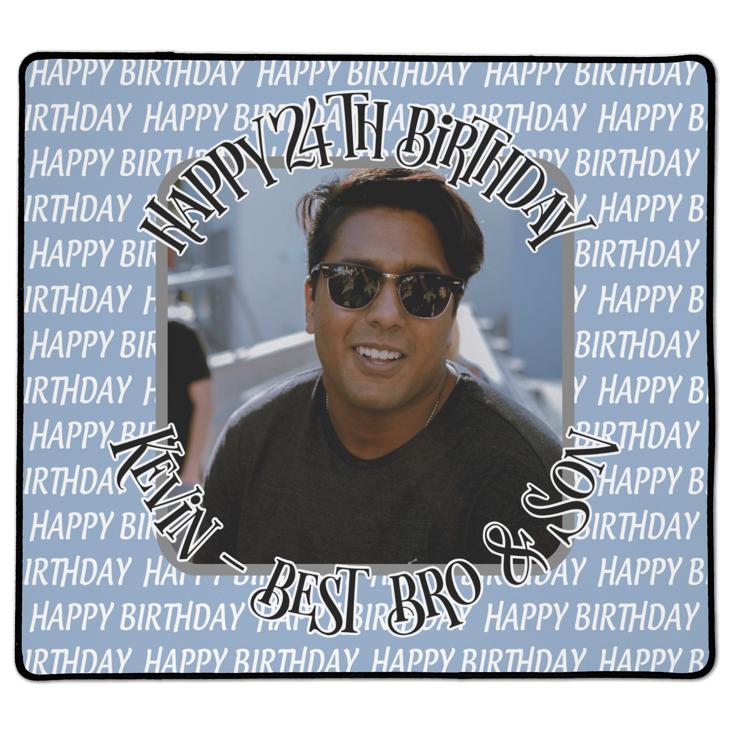 This design has a subtle background that says "Happy Birthday". You are able to upload your own picture of the birthday boy or girl right onto your design. The personalized text goes above and below your picture. This is a great design for pictures of you and the birthday boy/girl, so they can look at that cherished memory every day.