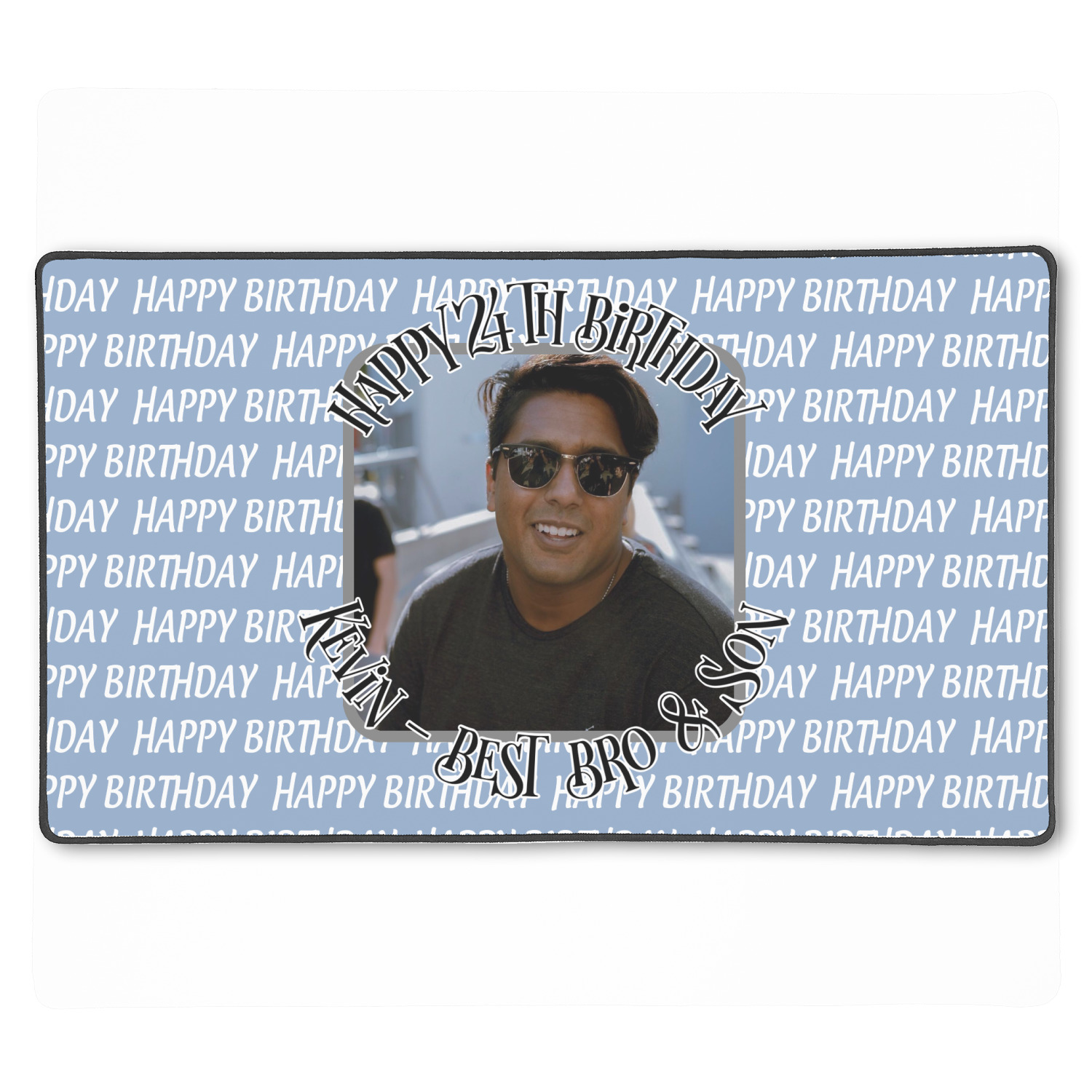 This design has a subtle background that says "Happy Birthday". You are able to upload your own picture of the birthday boy or girl right onto your design. The personalized text goes above and below your picture. This is a great design for pictures of you and the birthday boy/girl, so they can look at that cherished memory every day.