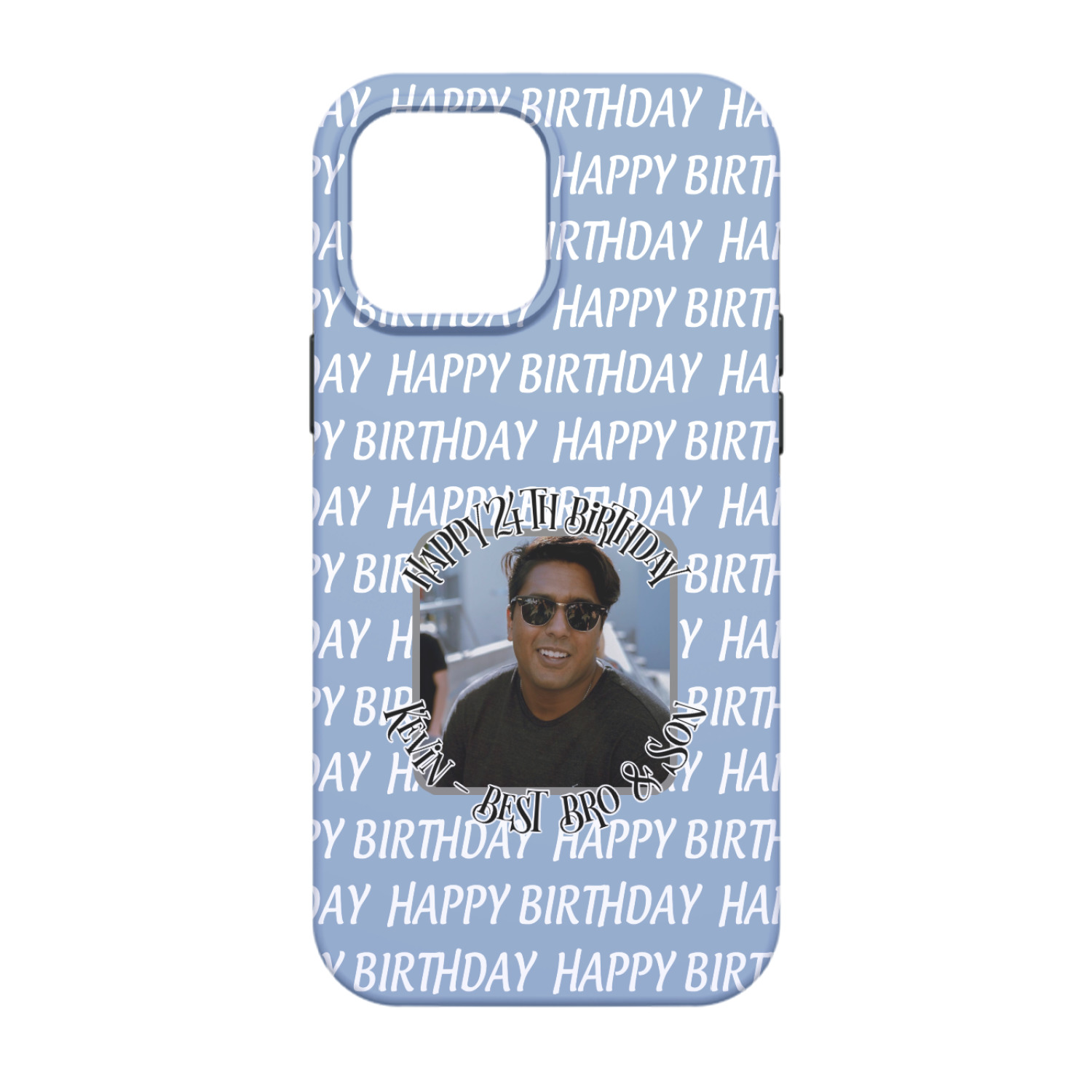 This design has a subtle background that says "Happy Birthday". You are able to upload your own picture of the birthday boy or girl right onto your design. The personalized text goes above and below your picture. This is a great design for pictures of you and the birthday boy/girl, so they can look at that cherished memory every day.