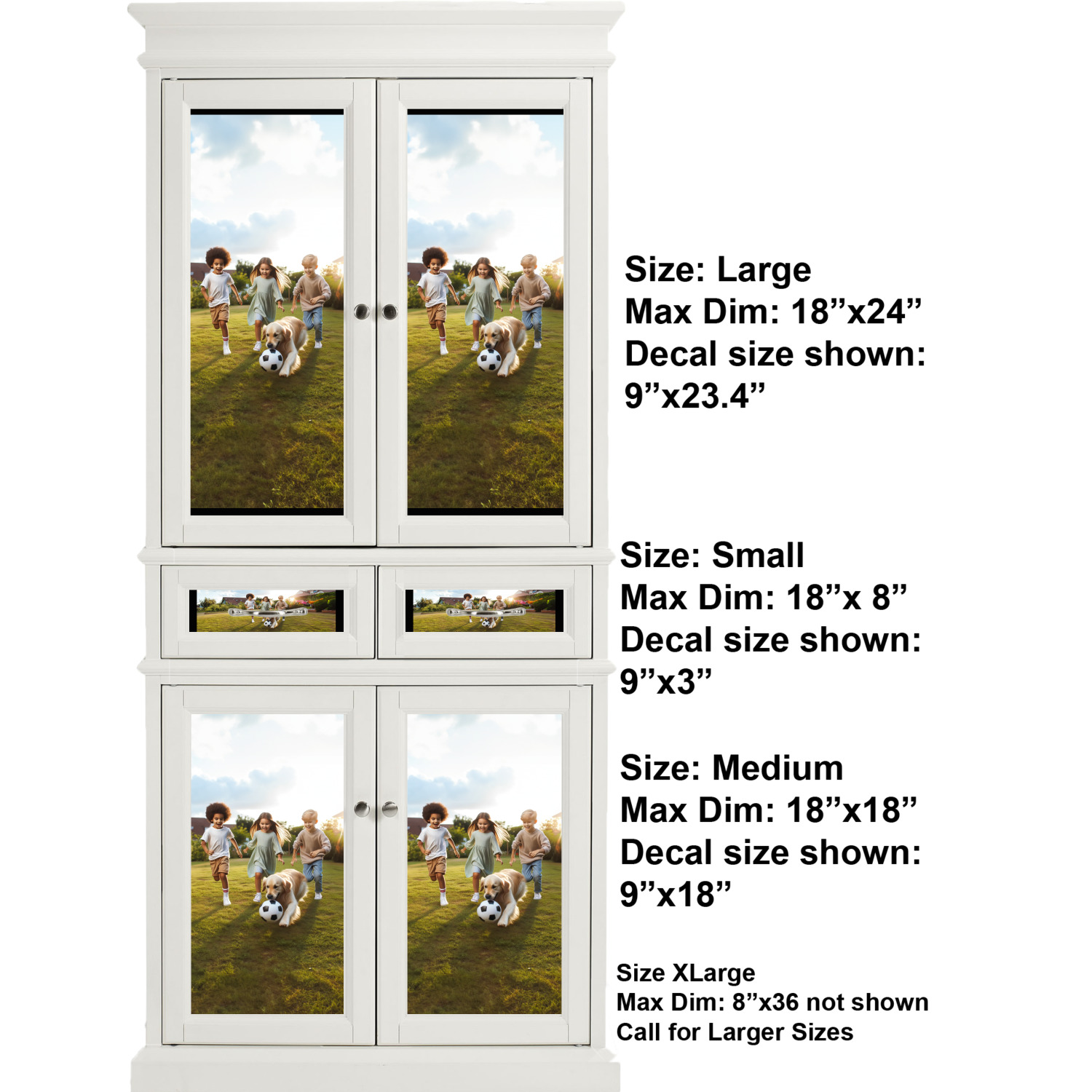 We print your customized design in full color, onto a high quality vinyl, covered with a glossy finish. For attachment to the cabinet, each cabinet sticker is accompanied by an easily applied, adhesive backing. The adhesive backing also guarantees a smooth removal or repositioning if desired. We sell these decals in four different sizes, but each size can be downsized appropriately to fit the needs of your kitchen. We offer a small, which is 18 by 8 inches, a medium, which is 18 by 18 inches, a large, at 24 by 18 inches, and an extra large, at 36 by 18 inches. We advise that you measure your cabinets first so you can make a properly informed purchase. For those who are interested in purchasing decals larger than 18 by 36 inches, please contact our team.