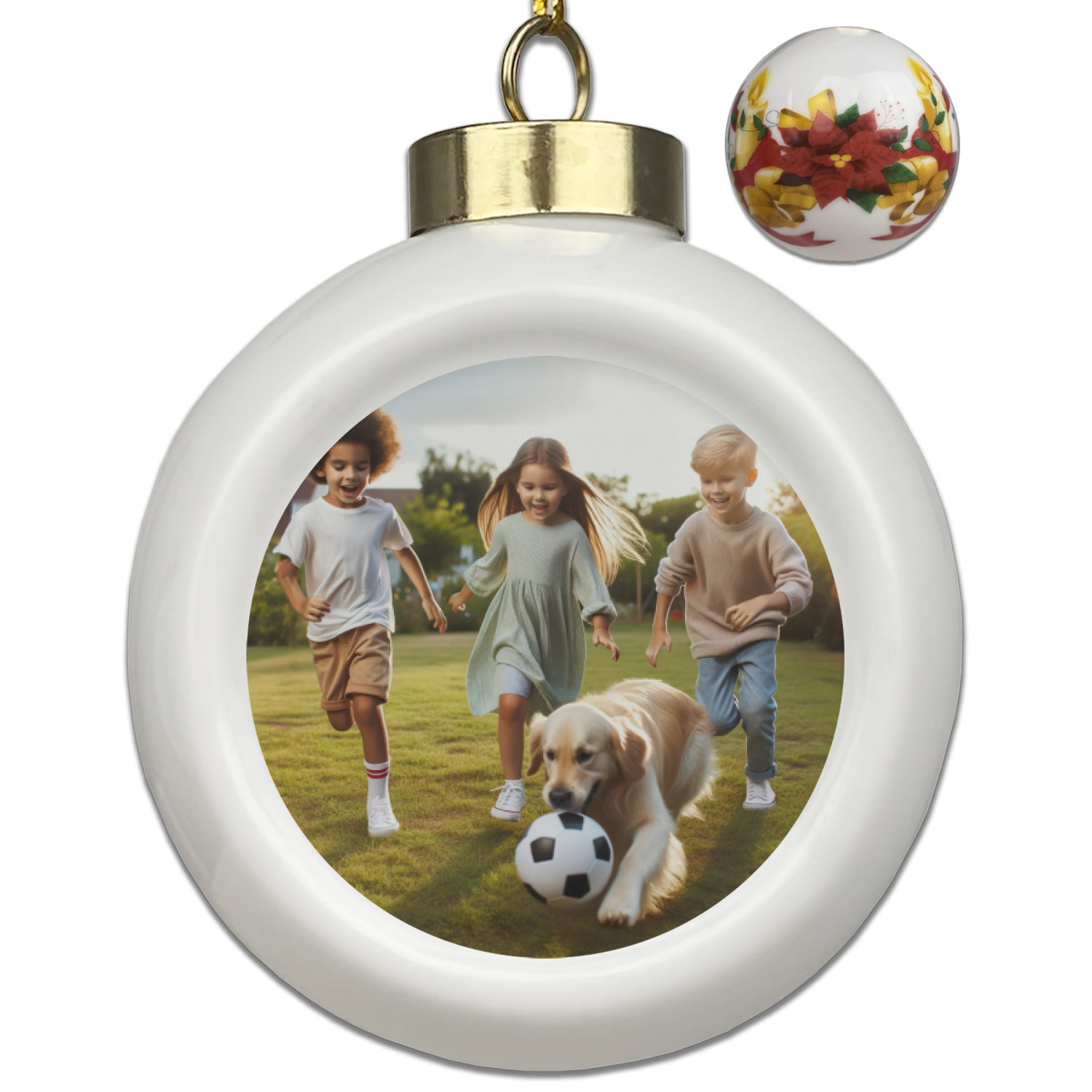 Our Christmas ornaments are a unique ceramic ball shape with a twist as it has a flat face to display your custom design! Select from one of our two design types - Christmas Tree or Poinsettia Garland - to adorn the curved back of your personal design. Each ornament measures 3H x 2.5W x 2D accompanied with a gold string accent for finishing touches to hang on your beautiful Christmas tree!