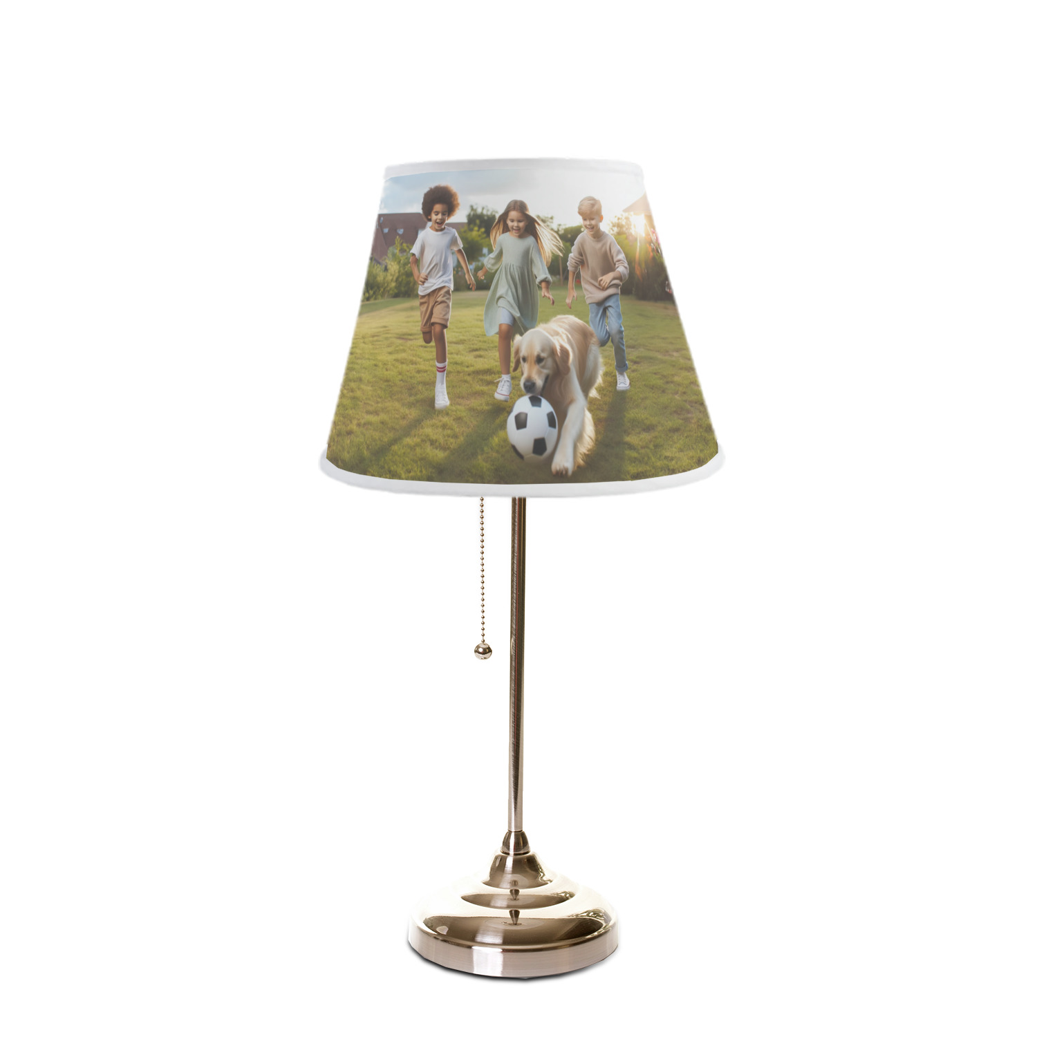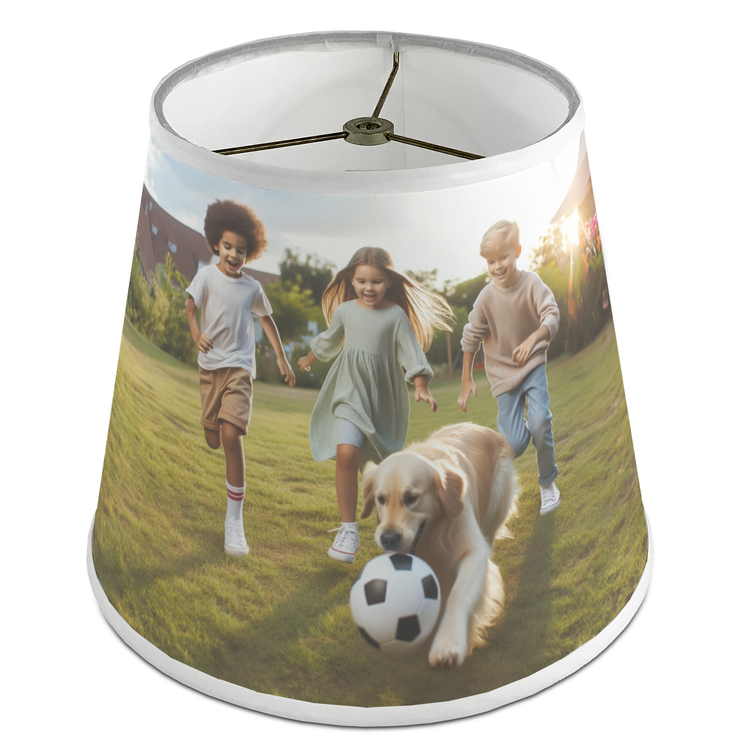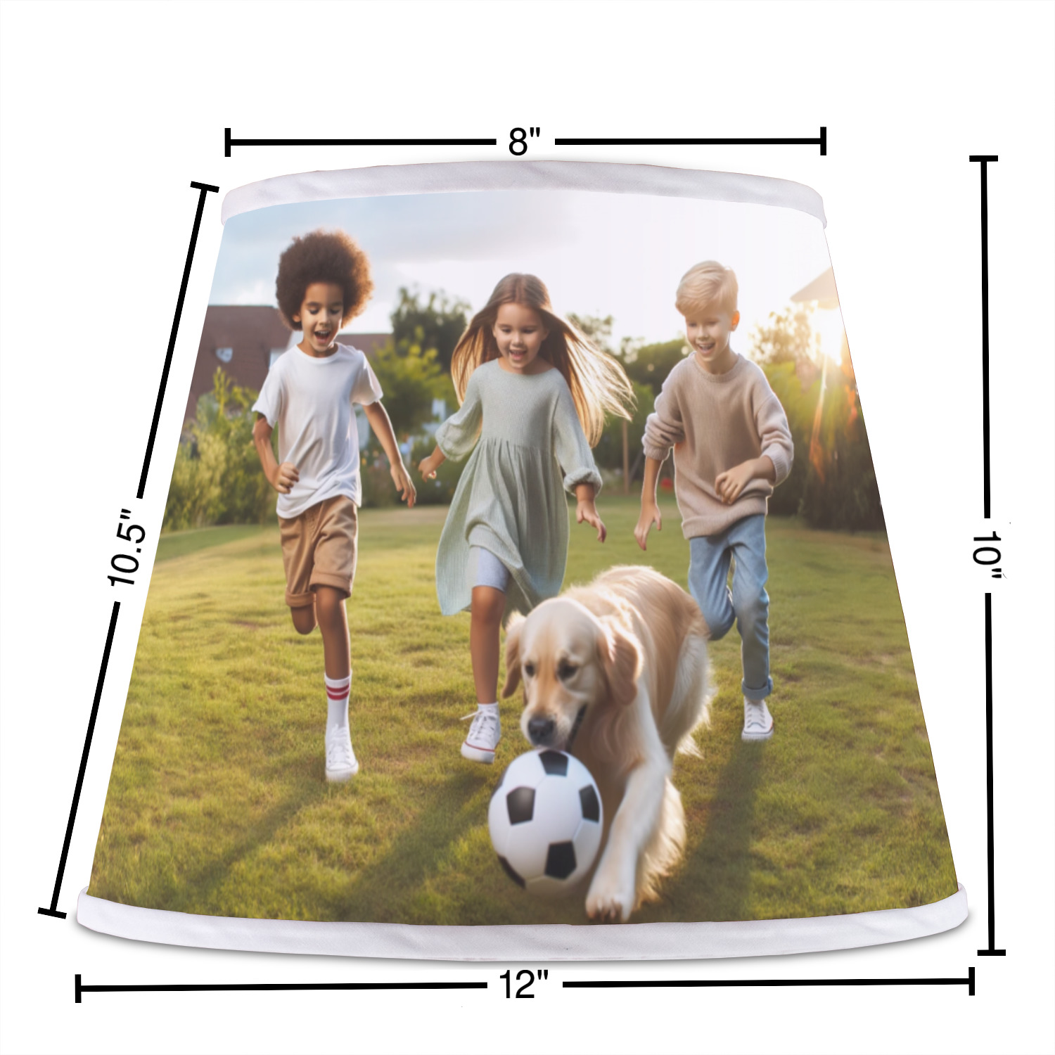The base of this lampshade is 12 inches in diameter, and the top spans 8 inches in diameter. The total height of the lampshade is 10 inches. The angled nature of this custom lampshade concentrates the light, making it ideal for smaller spaces. This lampshade is made of matte, polyfilm, and displays your customization in its middle. The top and bottom of this colorful lamp shade are lined with a white fabric ribbon (which can be replaced with black inside the design studio) which frames your design and creates a sophisticated finish. As an UNO fitter lampshade, this unique lamp shade will fit a variety of bases.