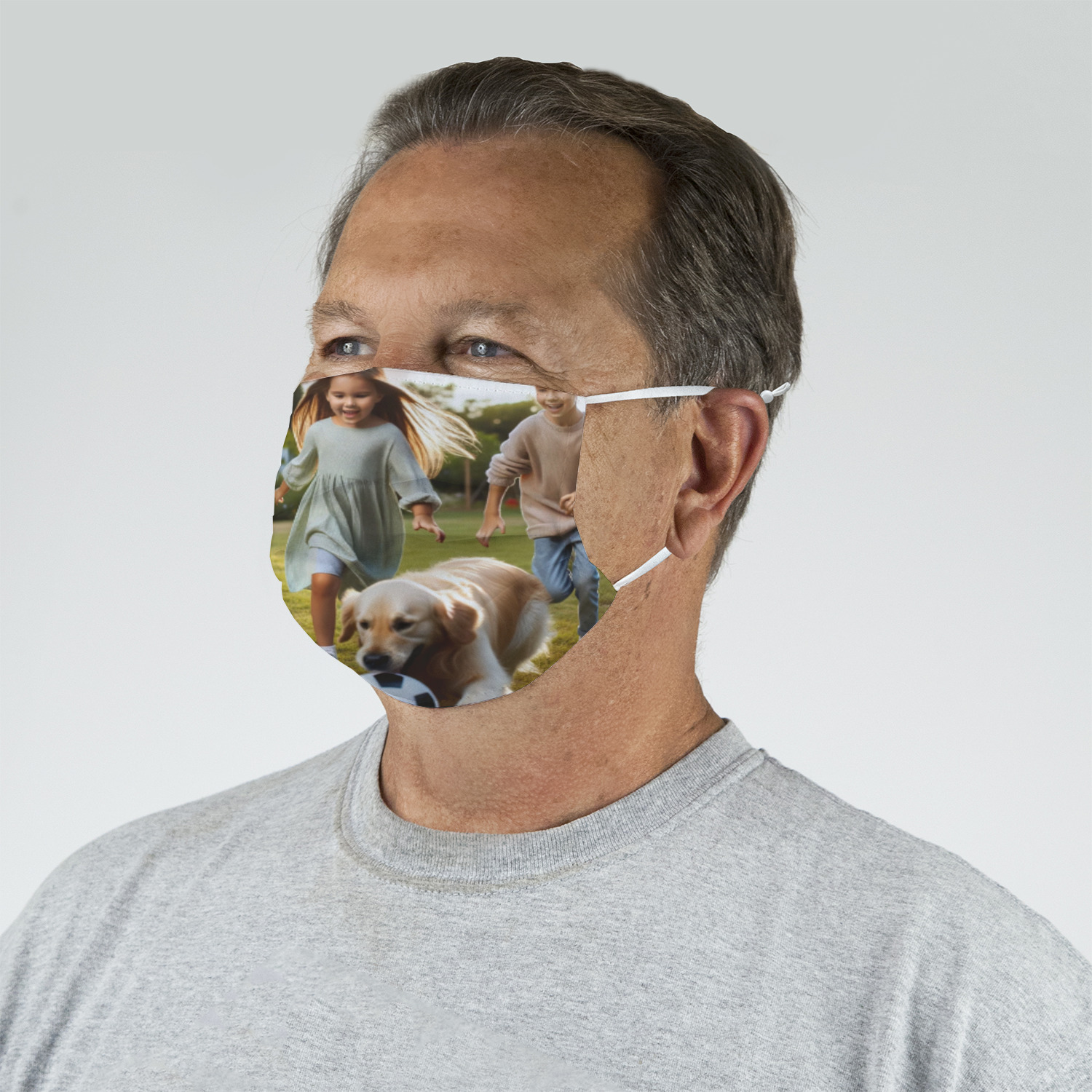These fun face masks are 7" wide and 3.5" high. They feature pleats, adjustable ear loops, and are made with two layers of fabric. The top layer where your design is printed is a breathable polyester sheeting, while the inside layer is a soft microfiber polyester