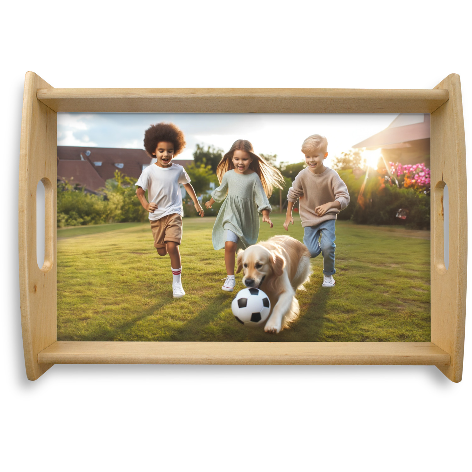 This serving tray with handles features square edges and two rounded sides, creating a very modern look. Each side is fabricated from a beautifully cut, natural wood. The bottom of the interior of the tray displays your customized design in bright, vibrant color. The tray is sold in both a black color and a natural wood look. Each variation of the wood serving tray has two sizes: Small, which is 14" x 10" x 2.25", and Large, which is 19.5" x 13.5" x 2.75".