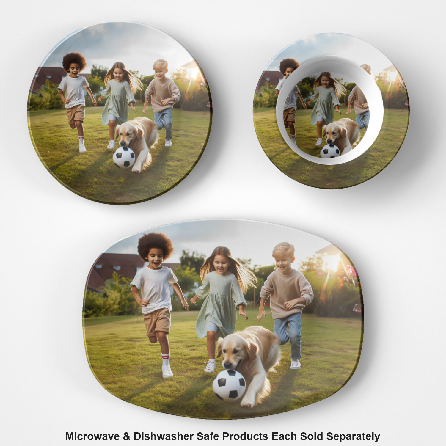Made from a composite, thermo-set, polymer plastic, these dinner bowls have the versatility, durability, and weight of a melamine bowl without any of the downsides of melamine. Unlike melamine dinnerware, these bowls can withstand high heat. These custom plastic bowls can even handle temperatures of up to 250 degrees Fahrenheit, for up to 60 minutes. The pieces of our plastic dinner set are never made with harmful chemicals, such as BPAs, formaldehyde, DEHPs. We display your personalization on the base of this bowl's interior, while the bowl itself has an 8.75" diameter and is 1.75" tall.