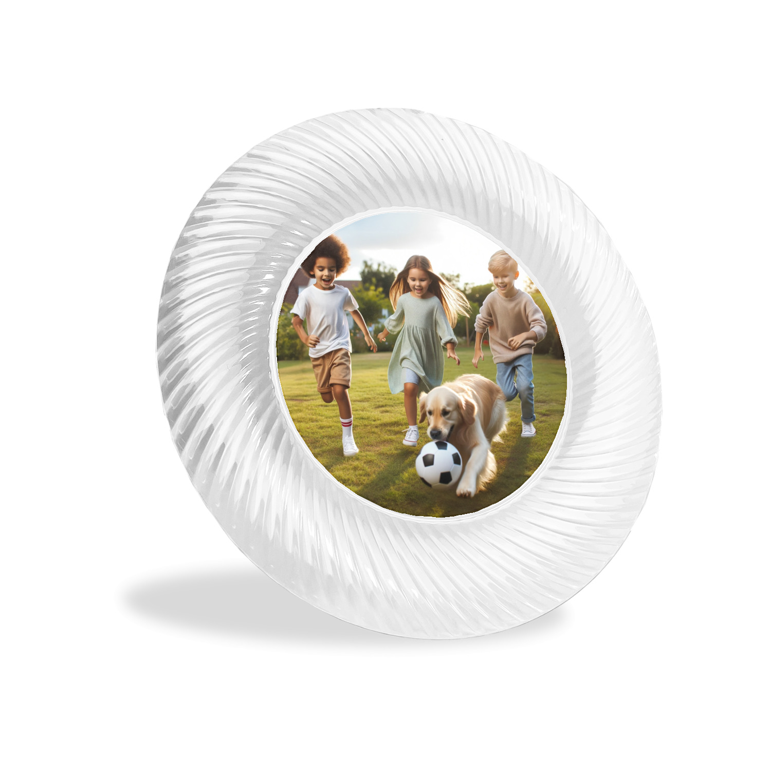 Made from a beautiful clear plastic plate as a base, your design is printed to the underside of the plate. The outside of the plate has a classic swirl texture to it for a high quality look and feel.
