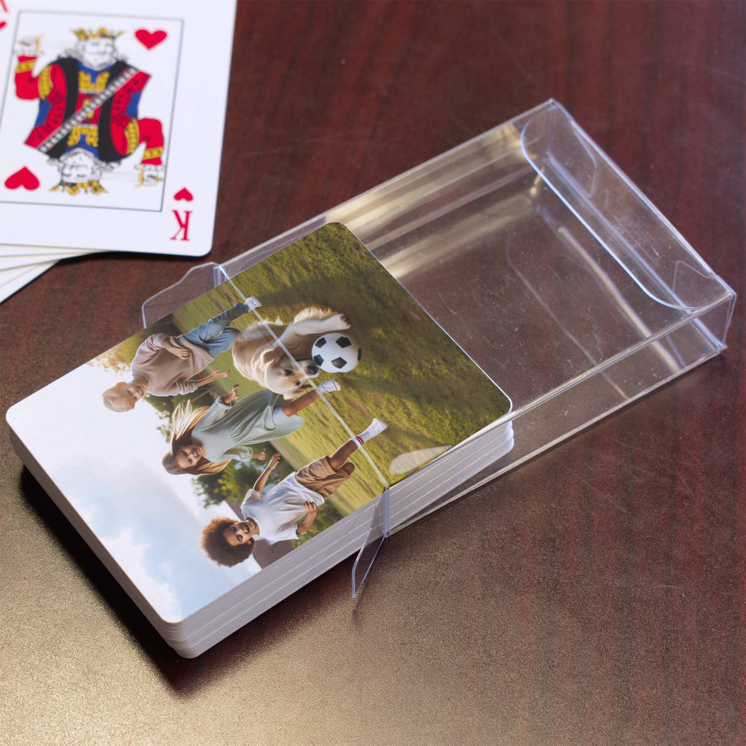 The customization / personalization is printed on the back side. The playing cards have a low gloss coating on both sides. The cards are packaged in a clear plastic box.