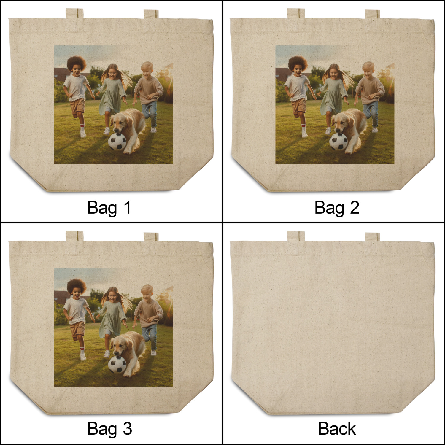 These cotton totes are washable and easy to care for, and they can be folded flat for storage. Your artwork, logo, or photo is printed in full color directly on the cotton tote in the front.