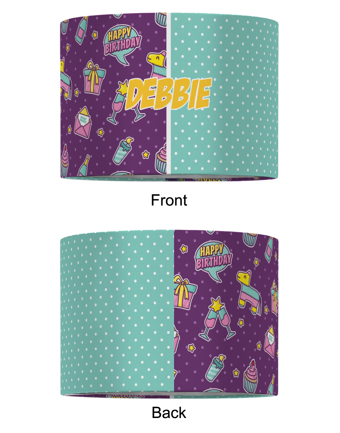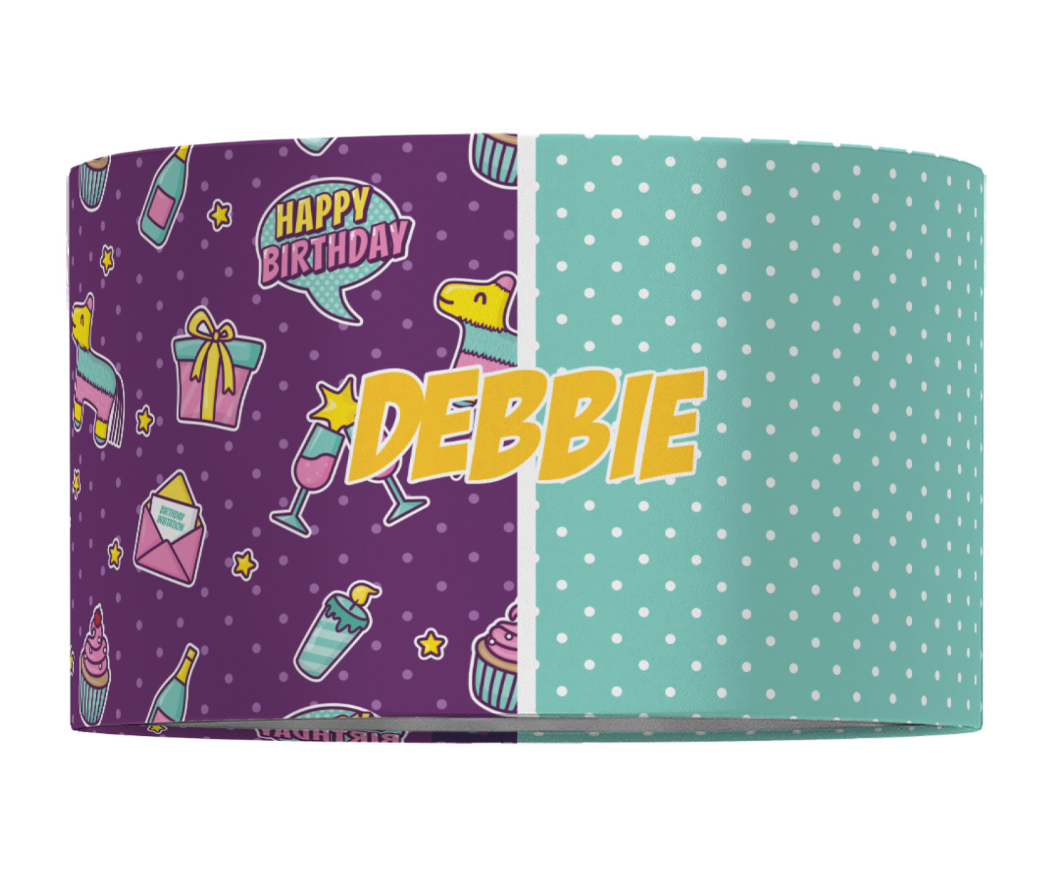 This is a two-pattern design and is split right down the middle. The left design is a bright purple with all kinds of birthday graphics including piñatas, "happy birthday" speech bubbles, presents, cupcakes and more! It also has a subtle purple polka dot pattern in the background. To compliment the polka dots, the secondary pattern is a mint green with white polka dots. Your personalization goes in the bottom right hand side, giving the design an asymmetrical feeling.