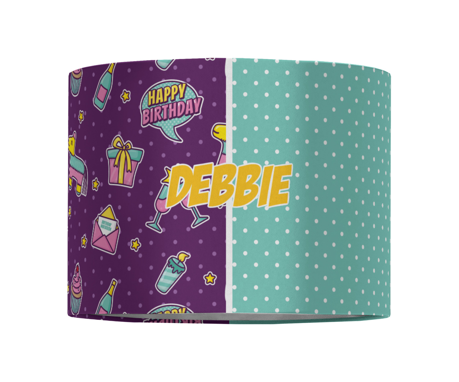 This is a two-pattern design and is split right down the middle. The left design is a bright purple with all kinds of birthday graphics including piñatas, "happy birthday" speech bubbles, presents, cupcakes and more! It also has a subtle purple polka dot pattern in the background. To compliment the polka dots, the secondary pattern is a mint green with white polka dots. Your personalization goes in the bottom right hand side, giving the design an asymmetrical feeling.